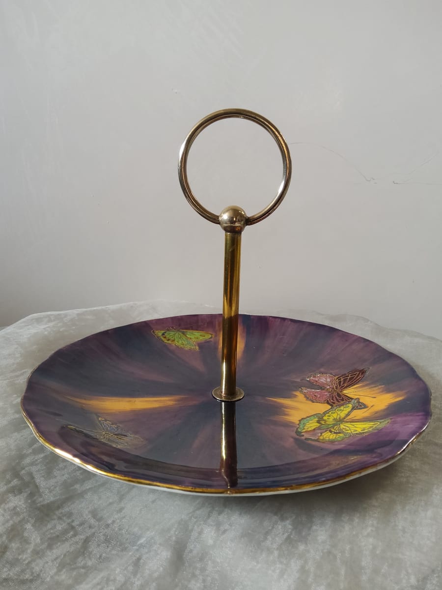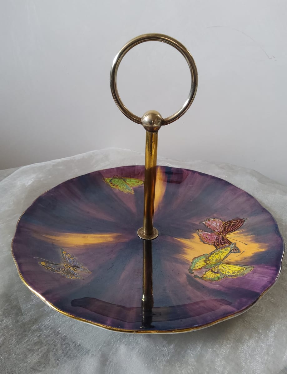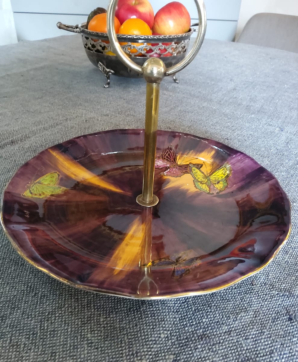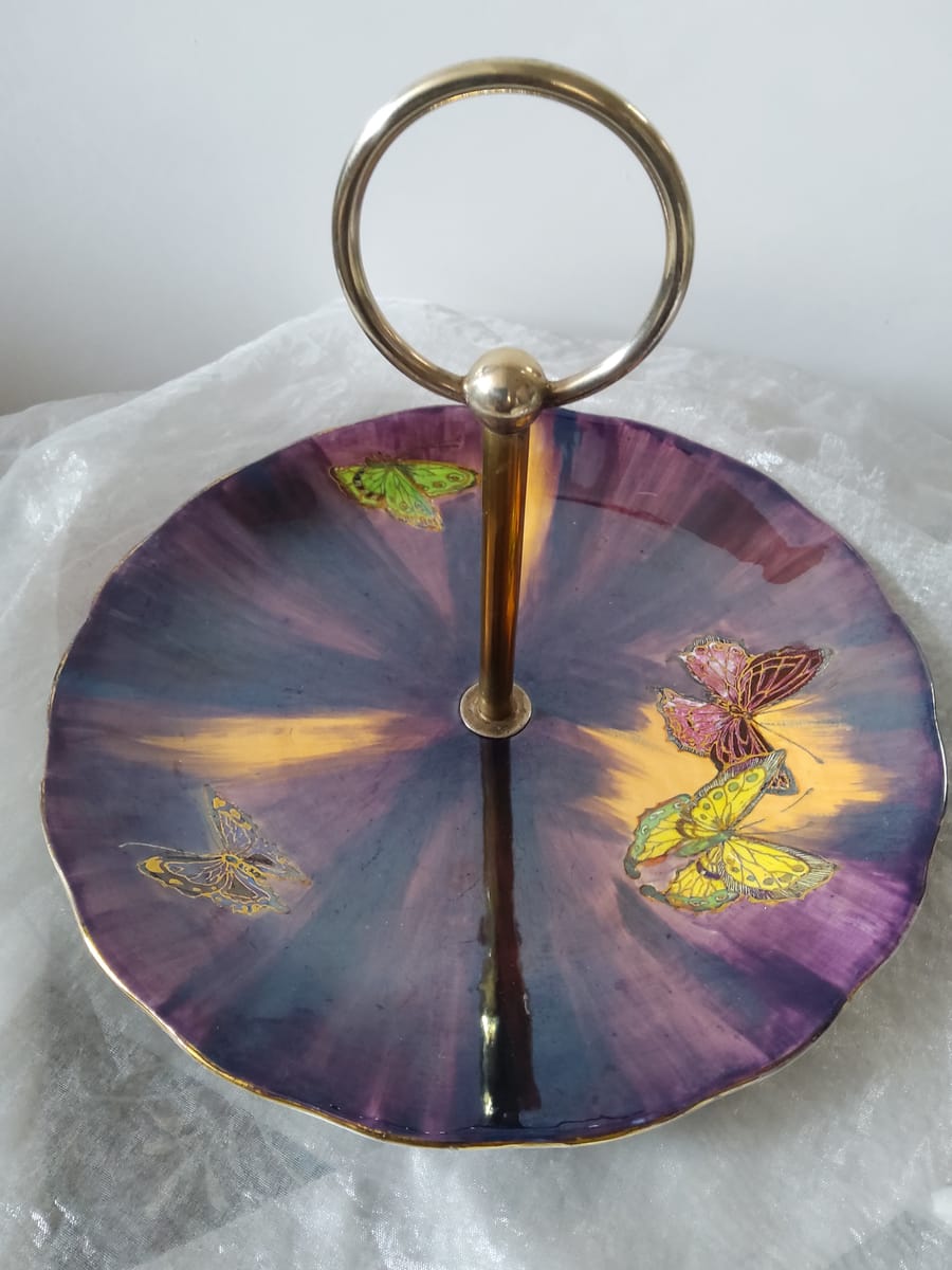 Изключително фин и елегантен поднос с метална висока дръжка, в преливащи лилави нюанси с жълто оранжеви акцентии красиви пеперуди.