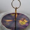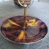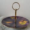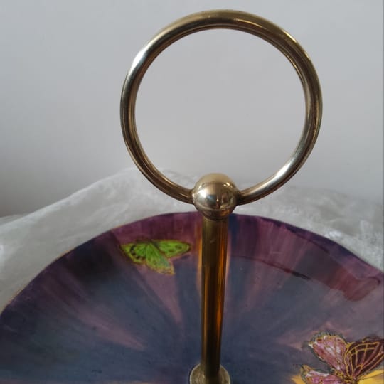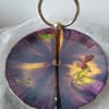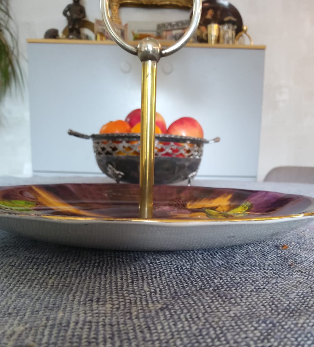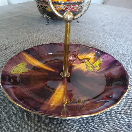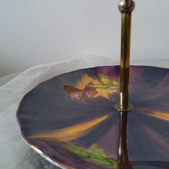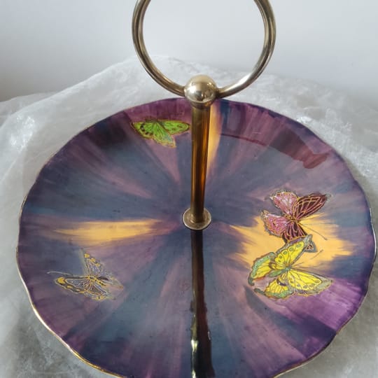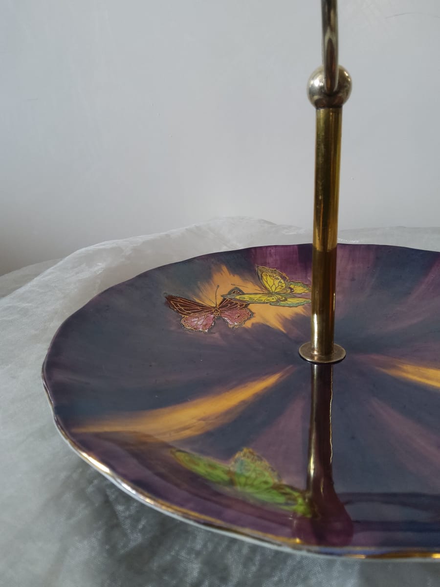 Изключително фин и елегантен поднос с метална висока дръжка, в преливащи лилави нюанси с жълто оранжеви акцентии красиви пеперуди.