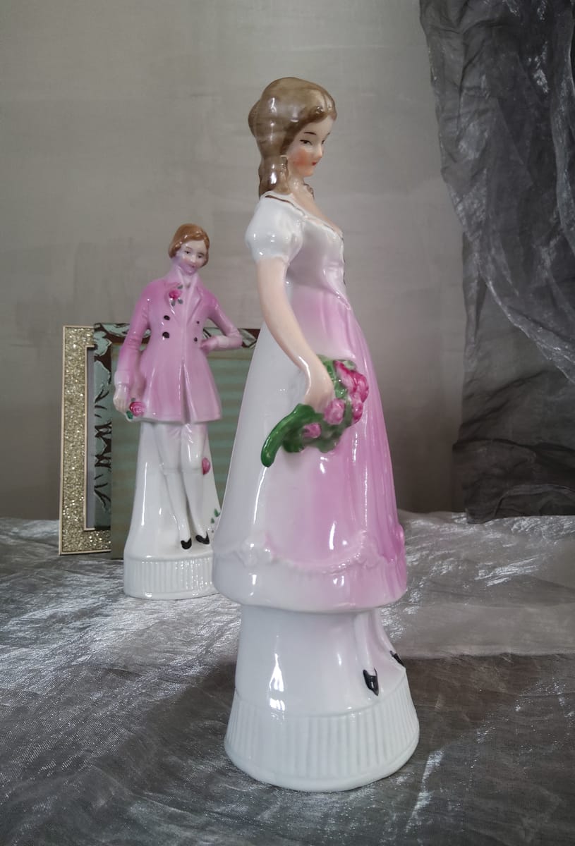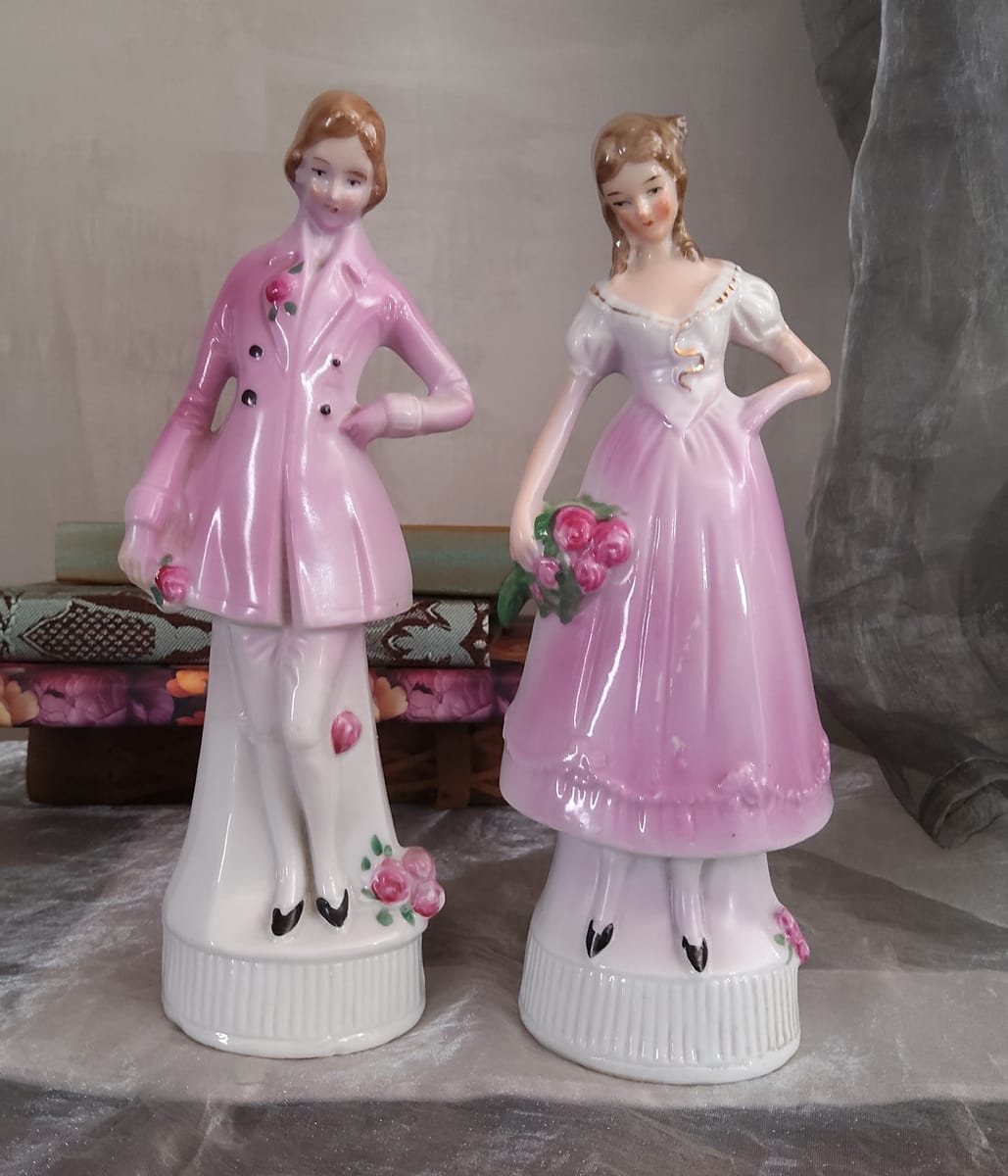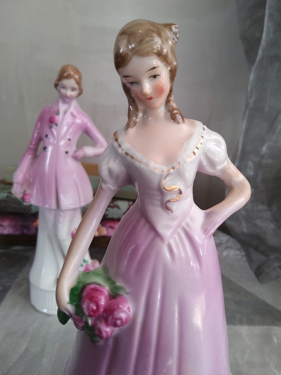 Фигурите са фино изработени, с нежни детайли – розови нюанси, ръчно оцветени цветя и изящни лица, които придават изключителна декоративна стойност.