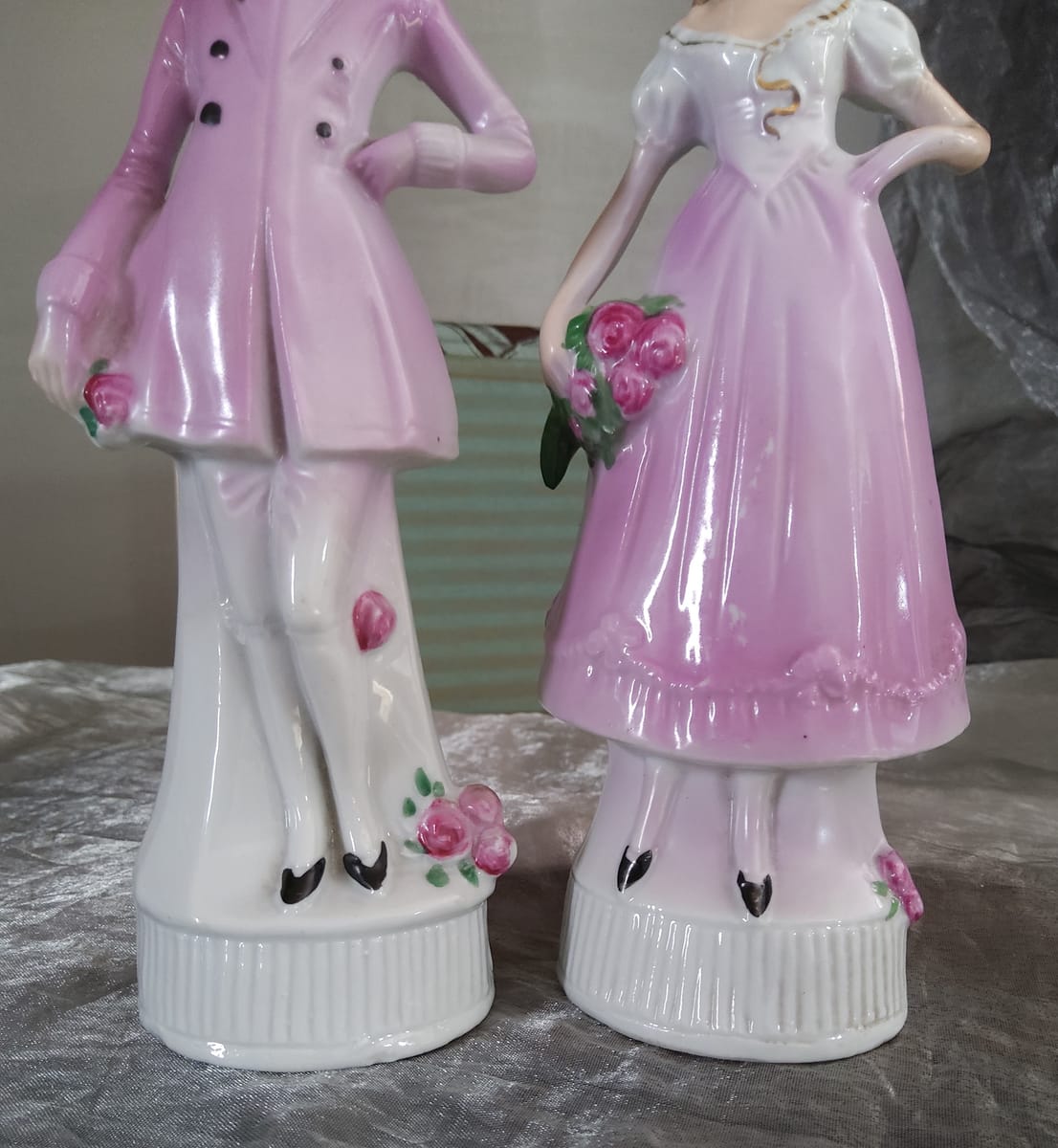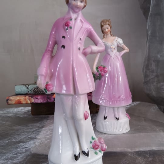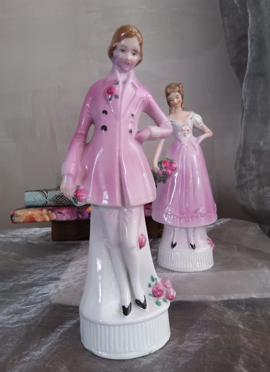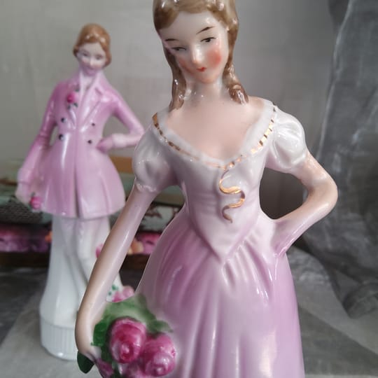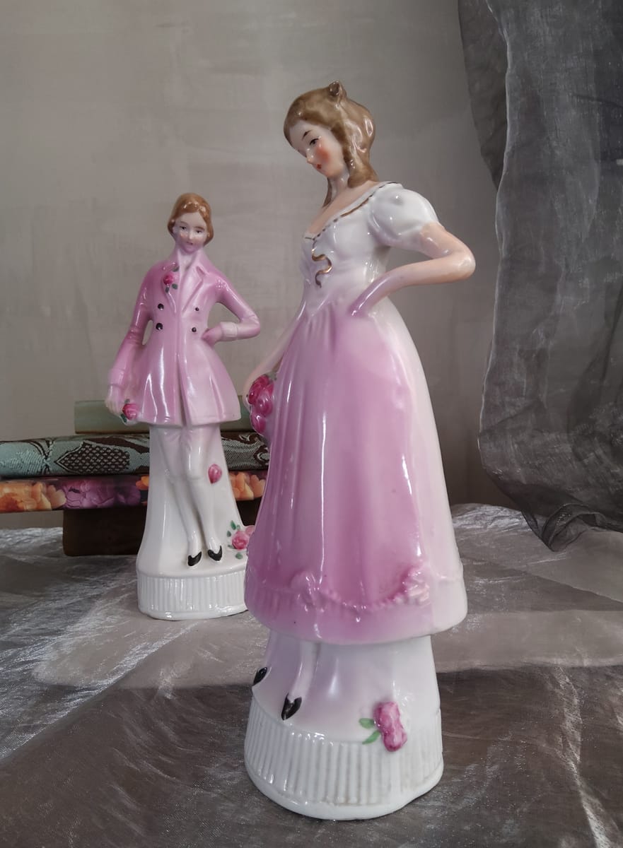 Фигурите са фино изработени, с нежни детайли – розови нюанси, ръчно оцветени цветя и изящни лица, които придават изключителна декоративна стойност.