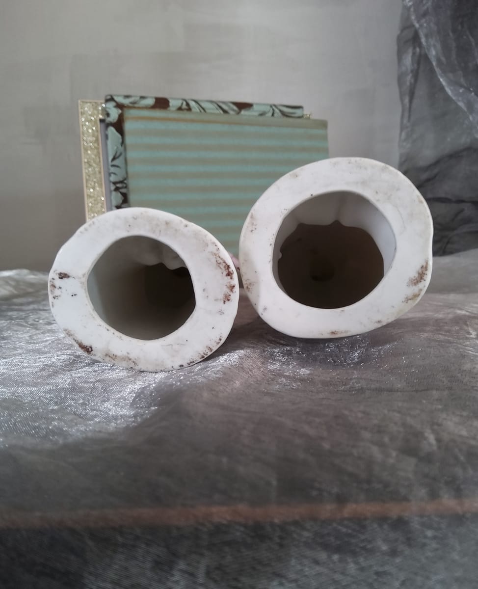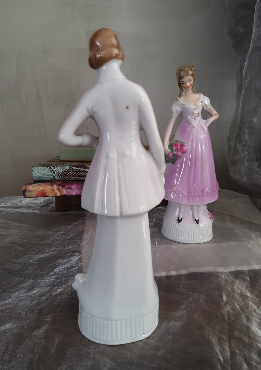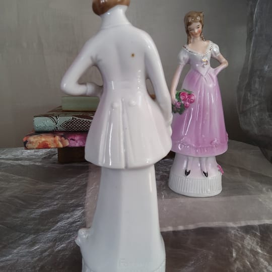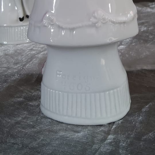 На гърба на статуетките има топъл печат „Foreign 4605“, който обикновено се използва при експортни порцеланови изделия от Европа. Подобни маркировки са характерни както за началото, така и за средата на XX век, така че не можем да посочим конкретен период. Много европейски фабрики, особено в Германия, Чехословакия и Япония, произвеждат декоративни порцеланови фигури за износ към западните пазари.
