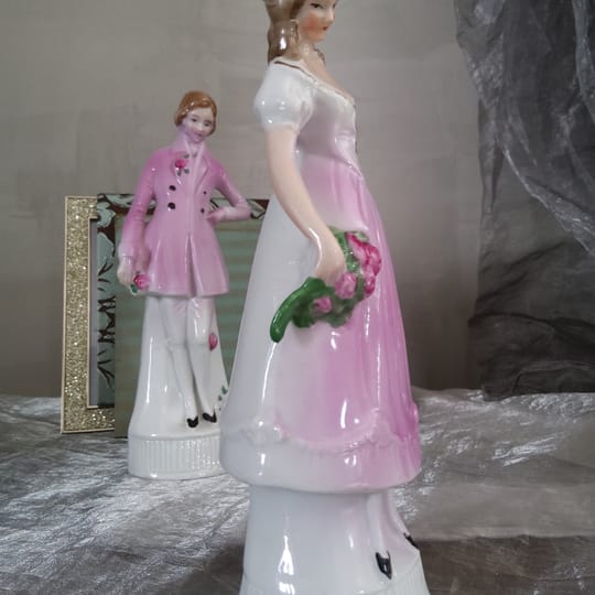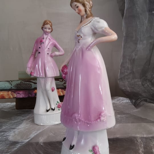 Изящна двойка декоративни порцеланови статуетки, изобразяващи елегантна дама и кавалер в романтичен, викториански стил.