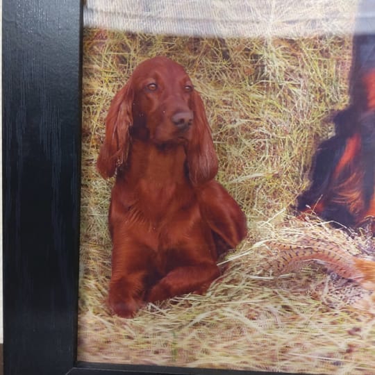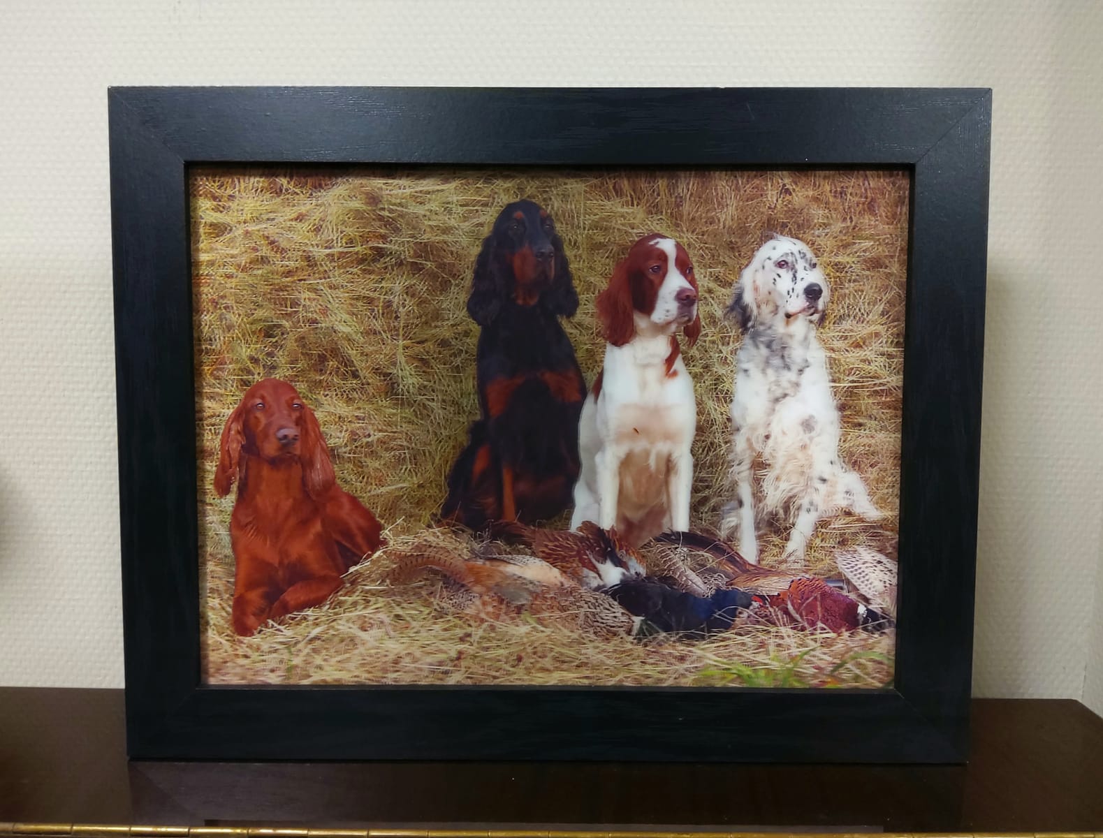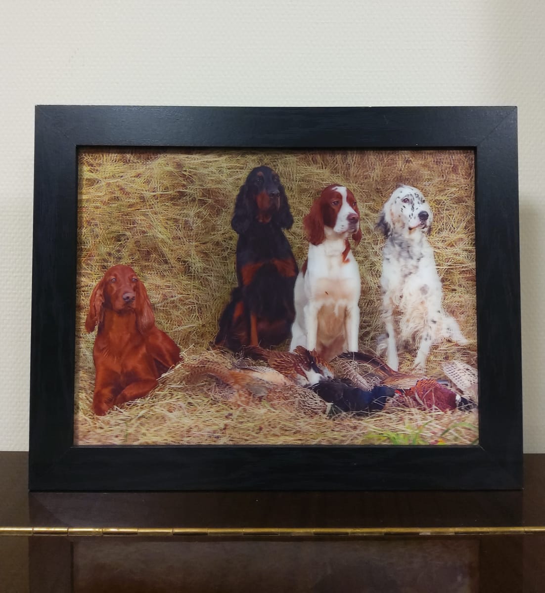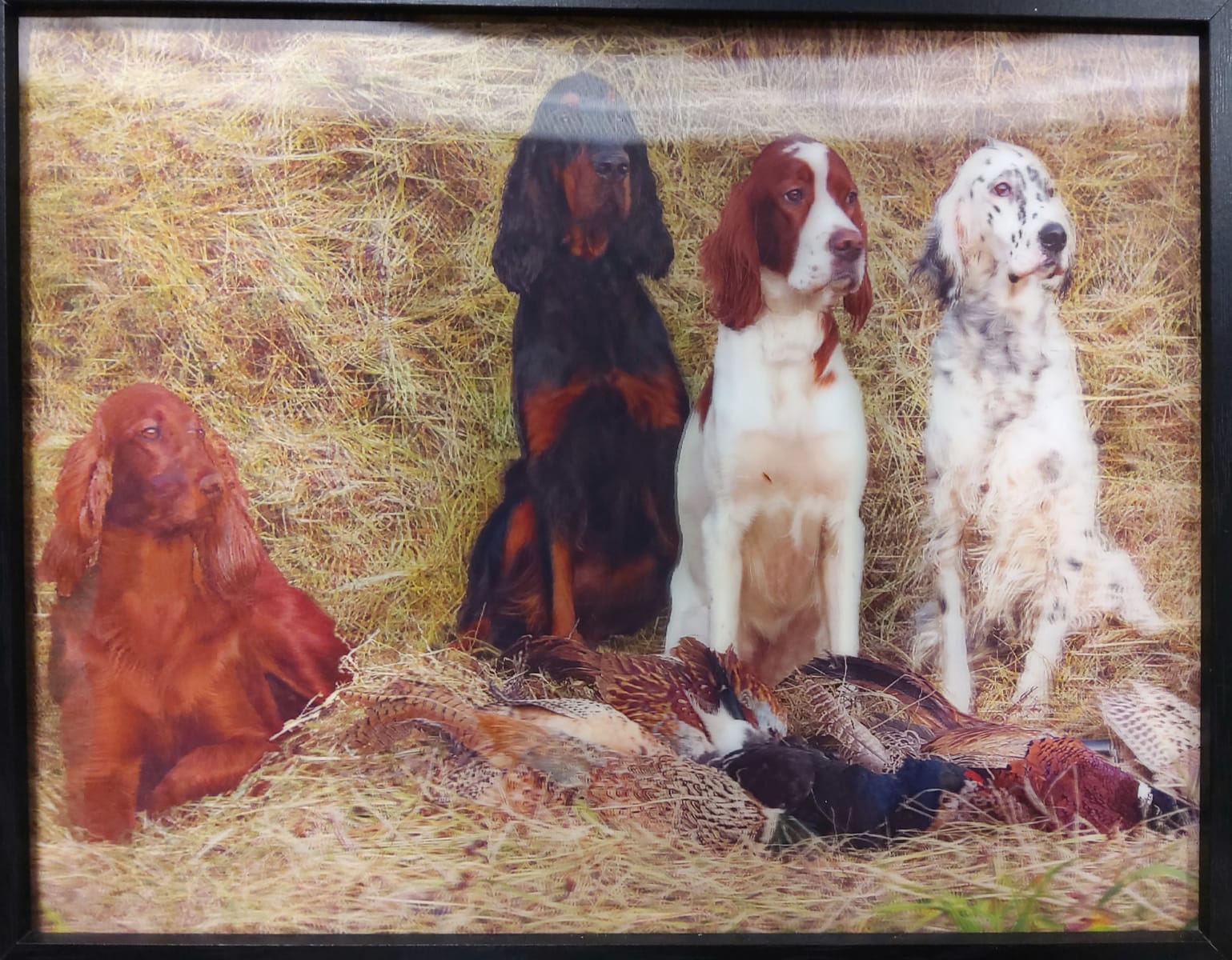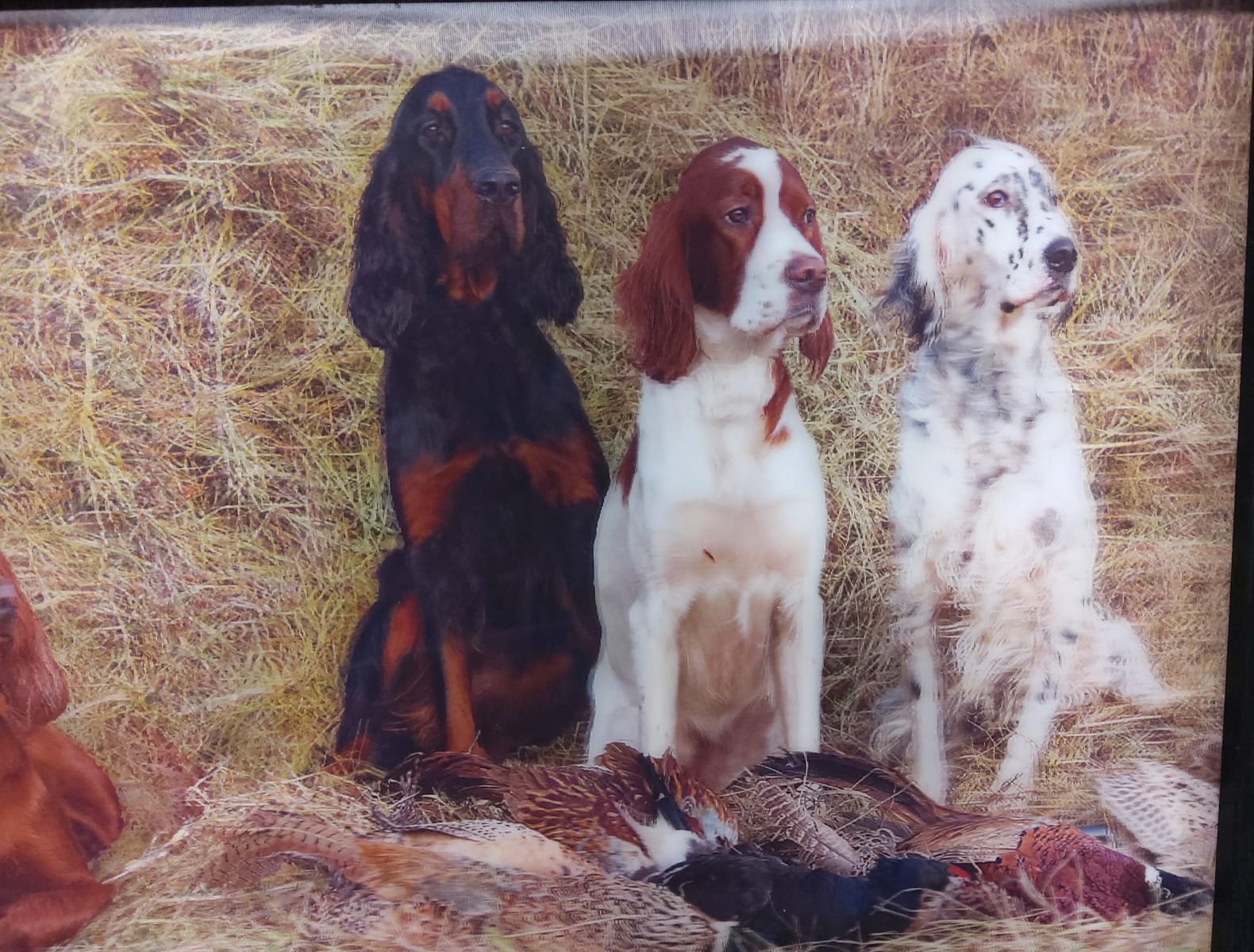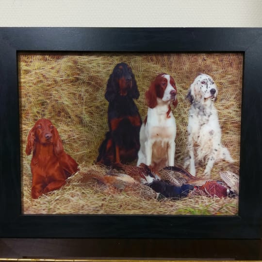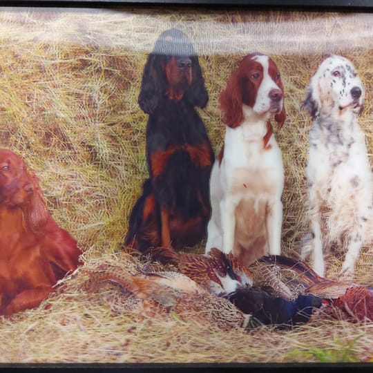 Нашите красиви с различните си окраски кучета, порода Сетер, току що са приключили ловния си ден и гордо позират за снимка "следящи ни с очи".