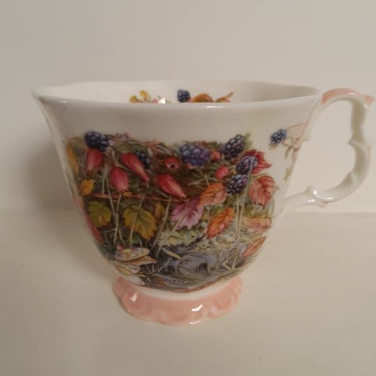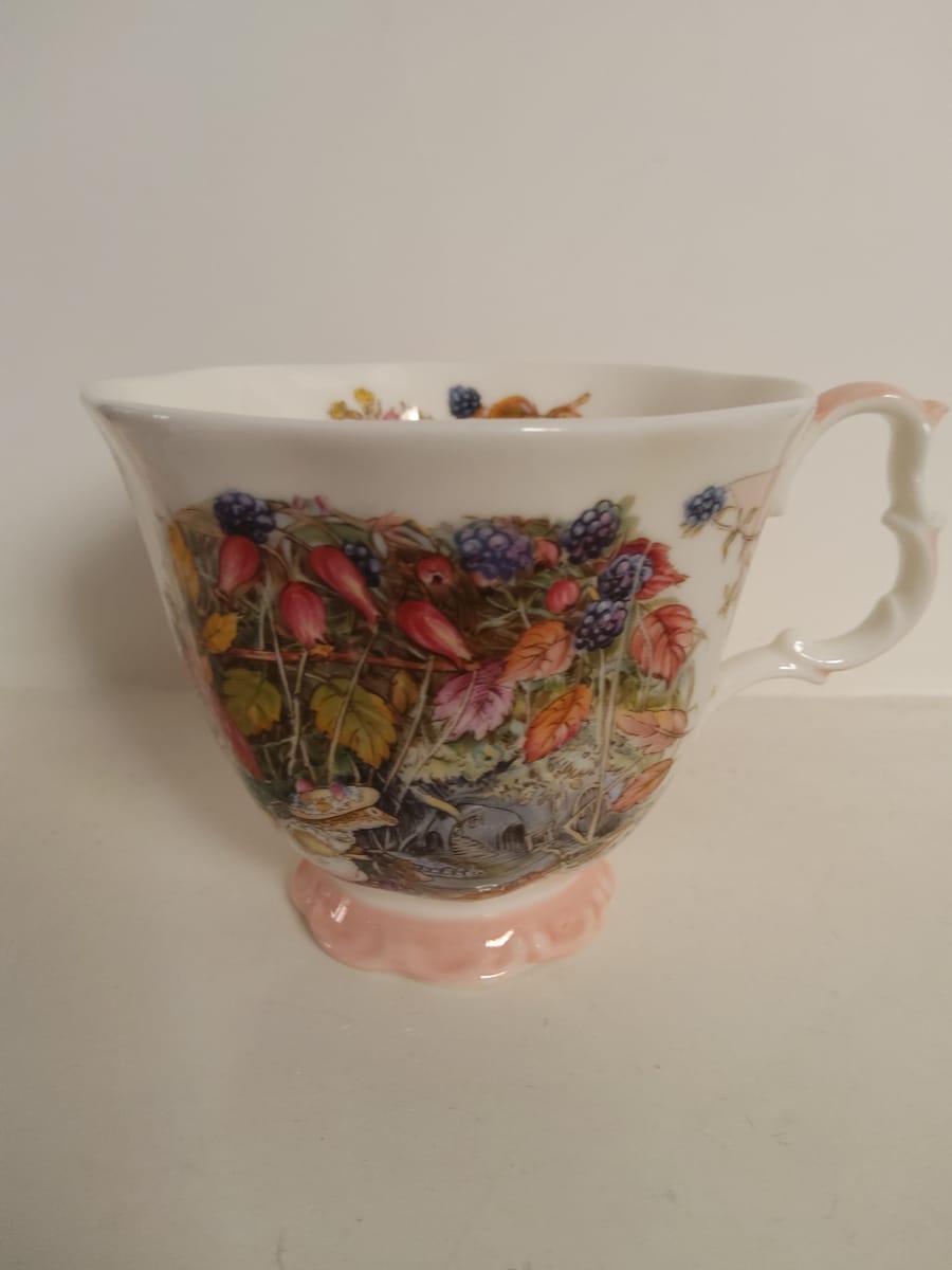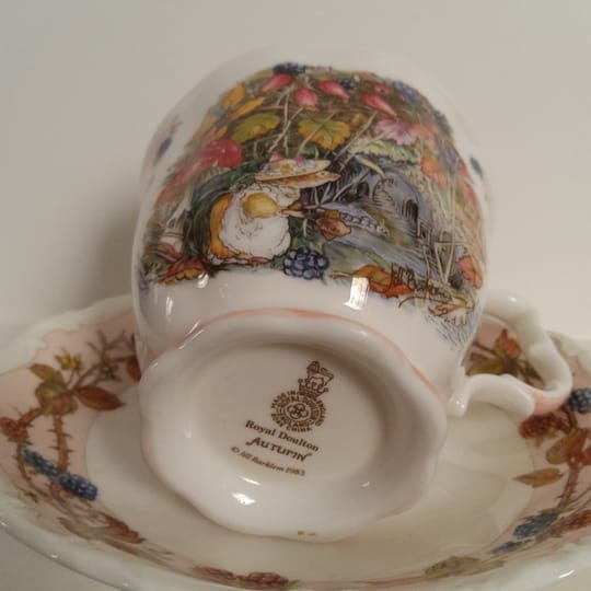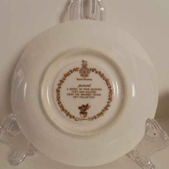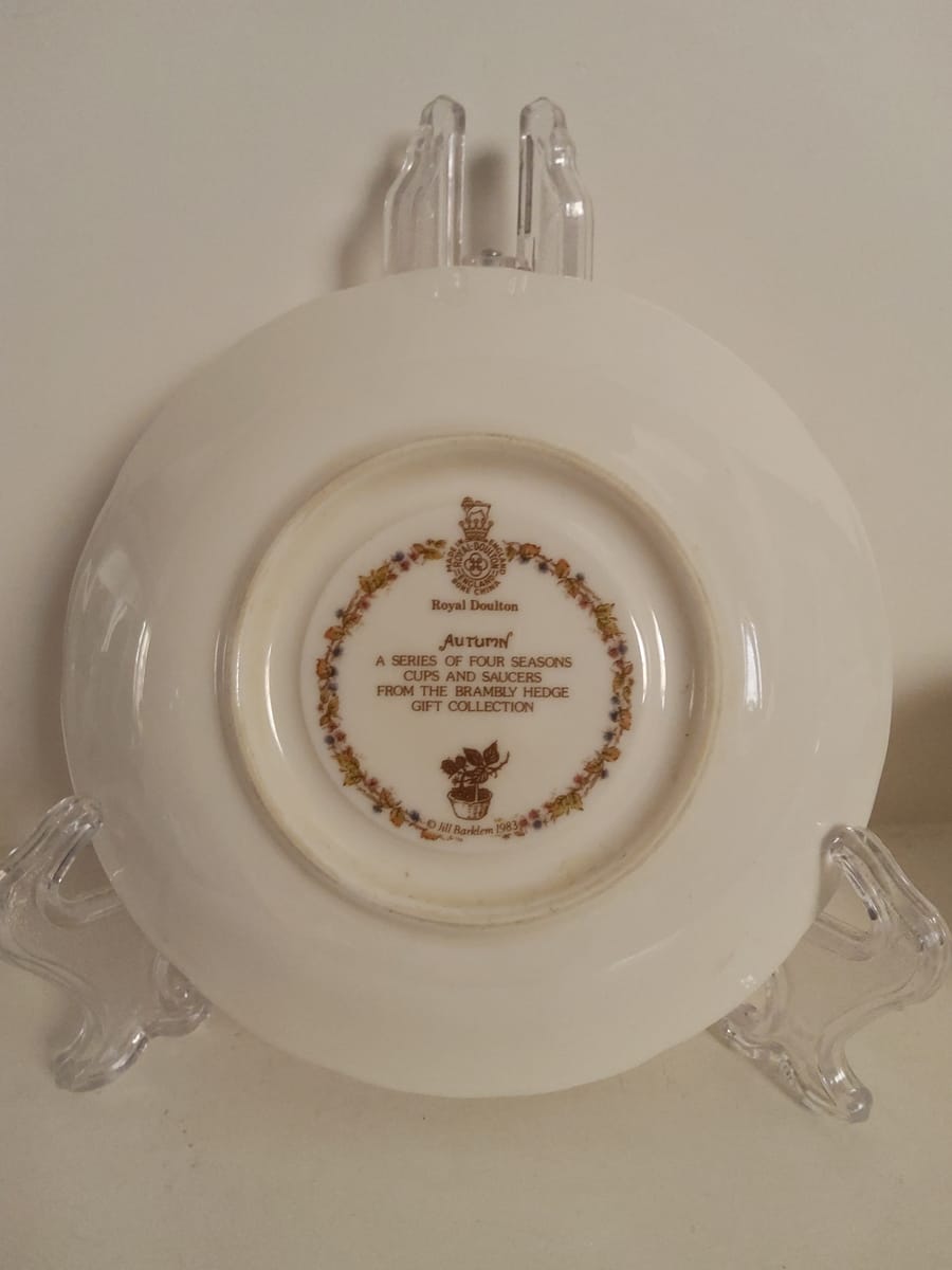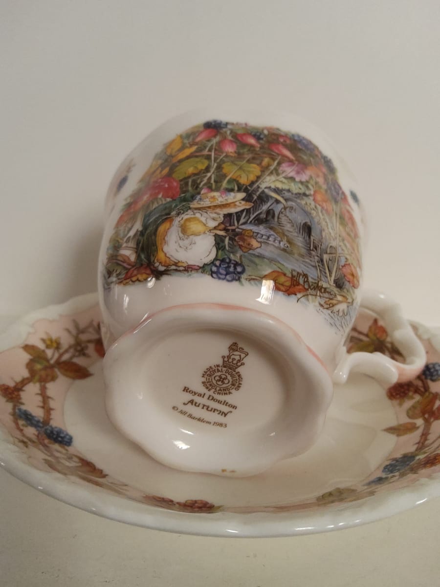 Красив винтидж колекционерски комплект за чай Royal Doulton "Есен" от серията Brambly Hedge Four Seasons. Комплектът включва миниатюрна чаша за чай с подходяща чинийка от фин порцелан.