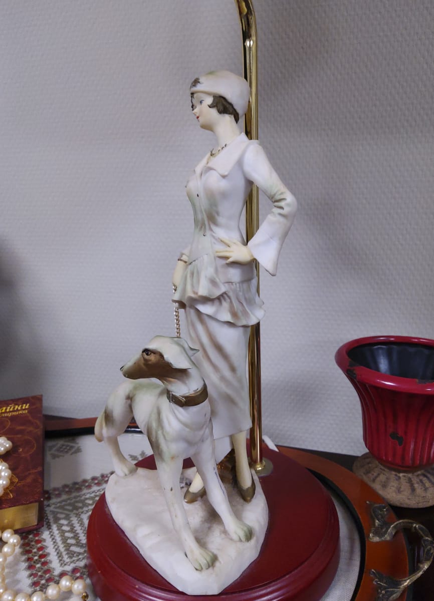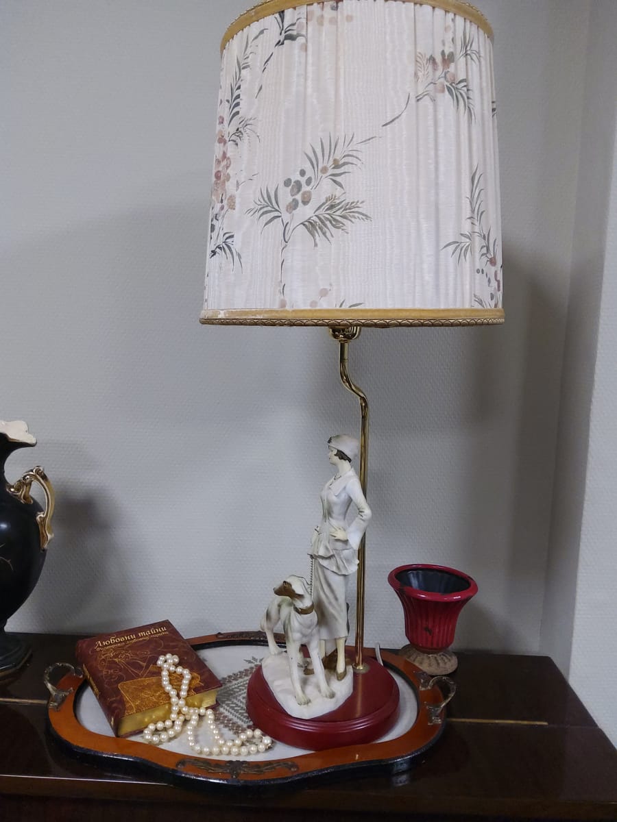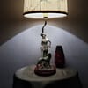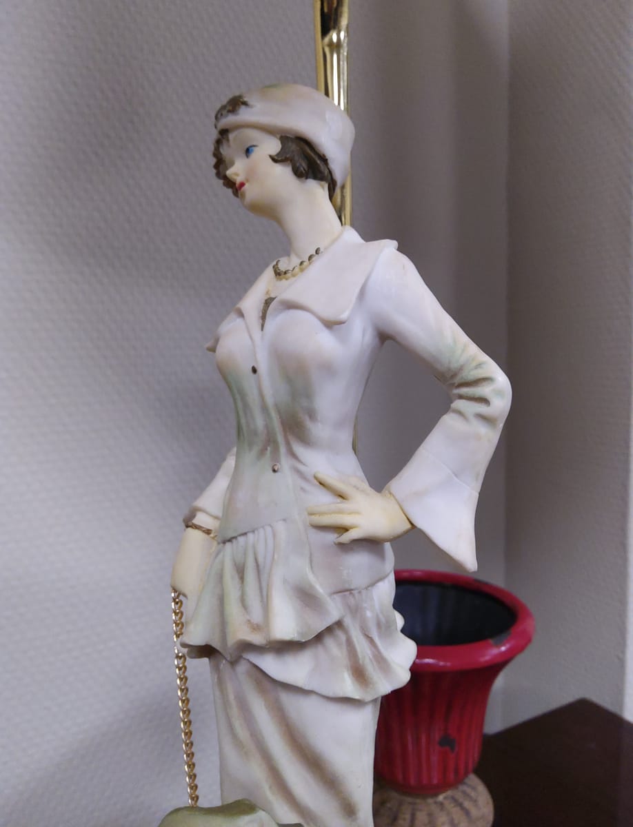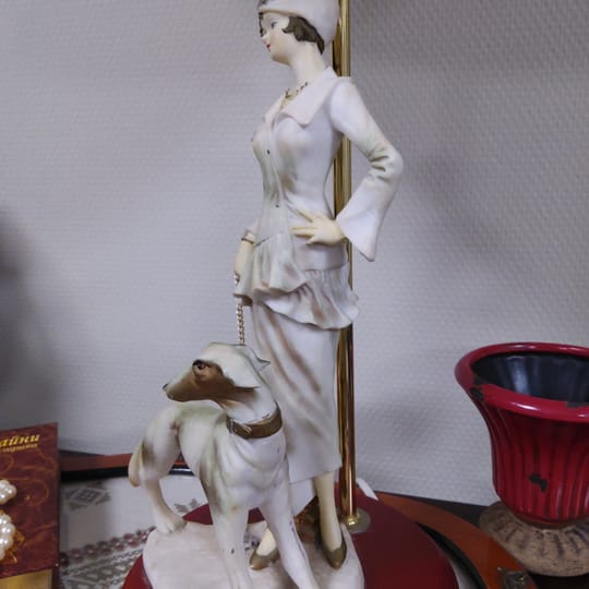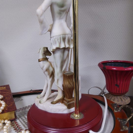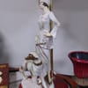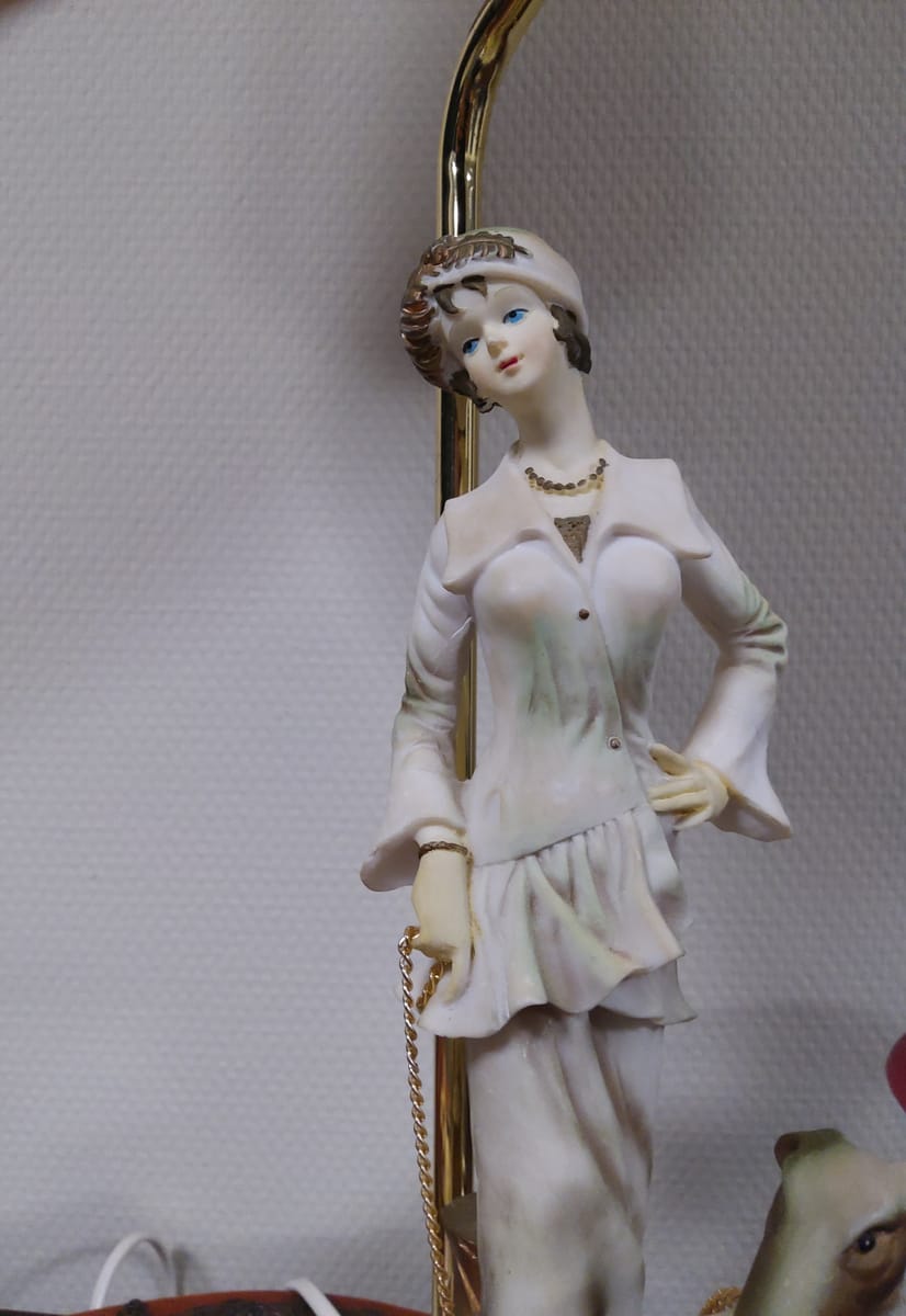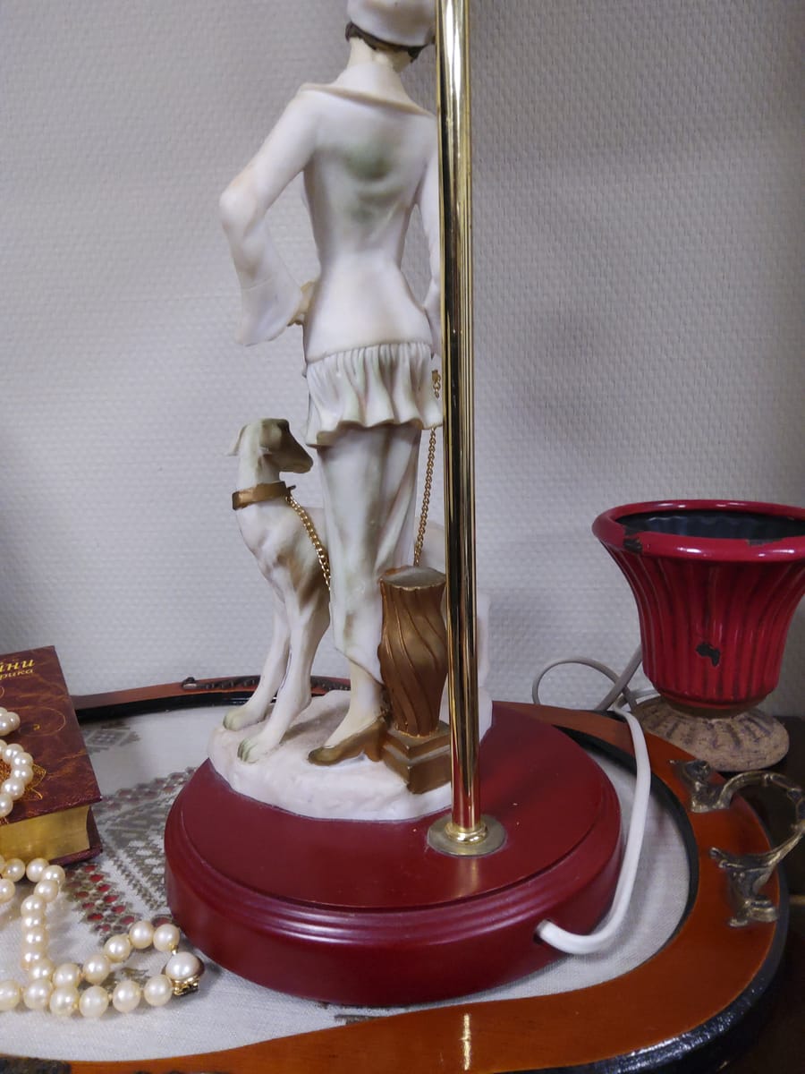 Превъзходни детайли, порцеланова статуетка с дървен постамент в много добро състояние. Метална част към осветителното тяло с пластмасова чашка.