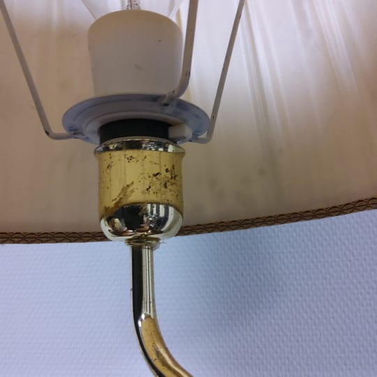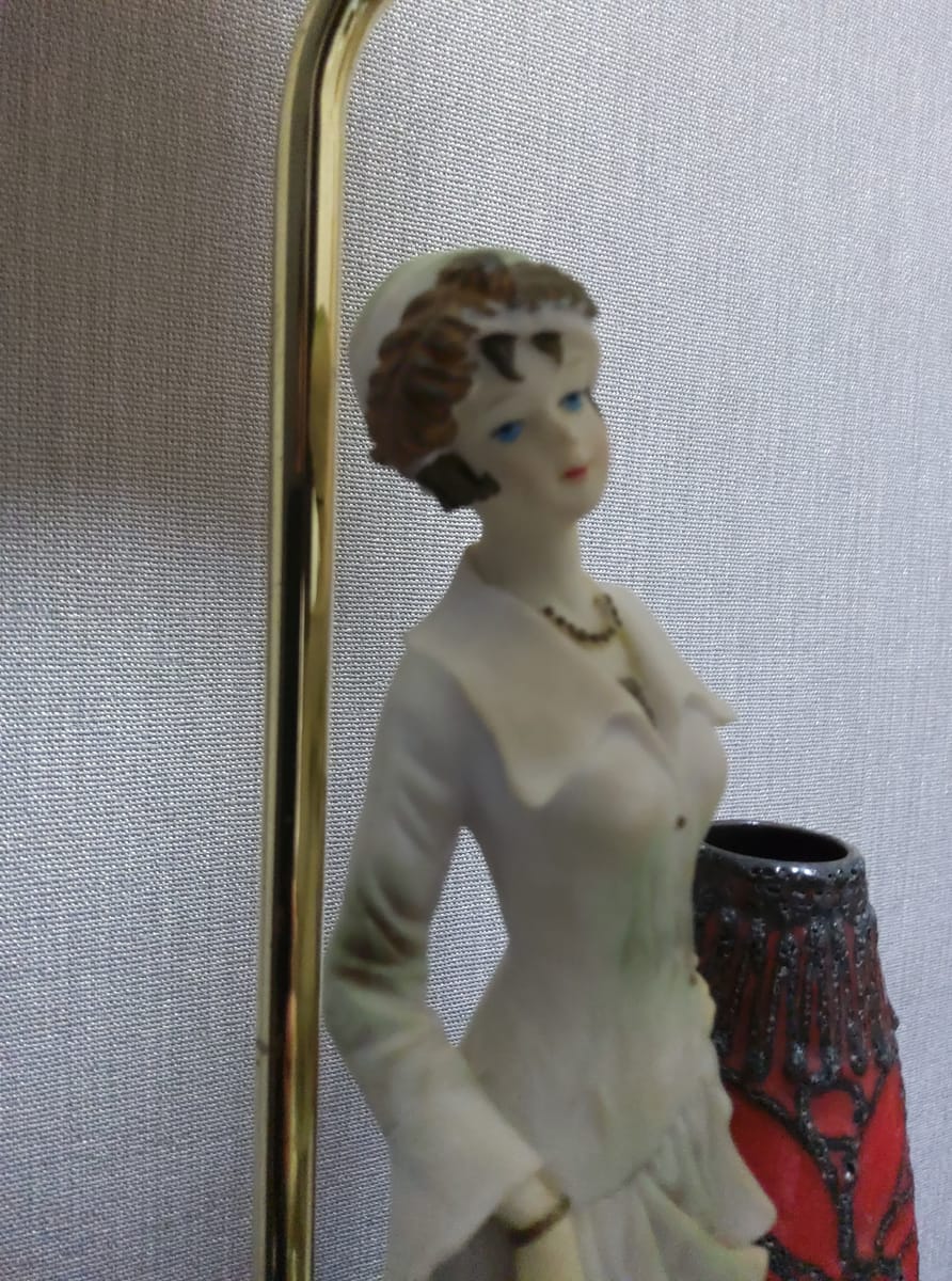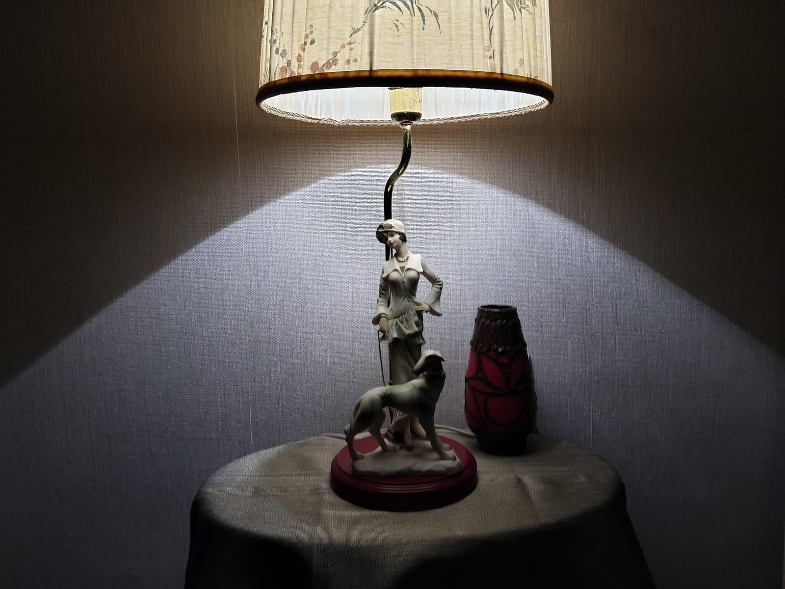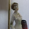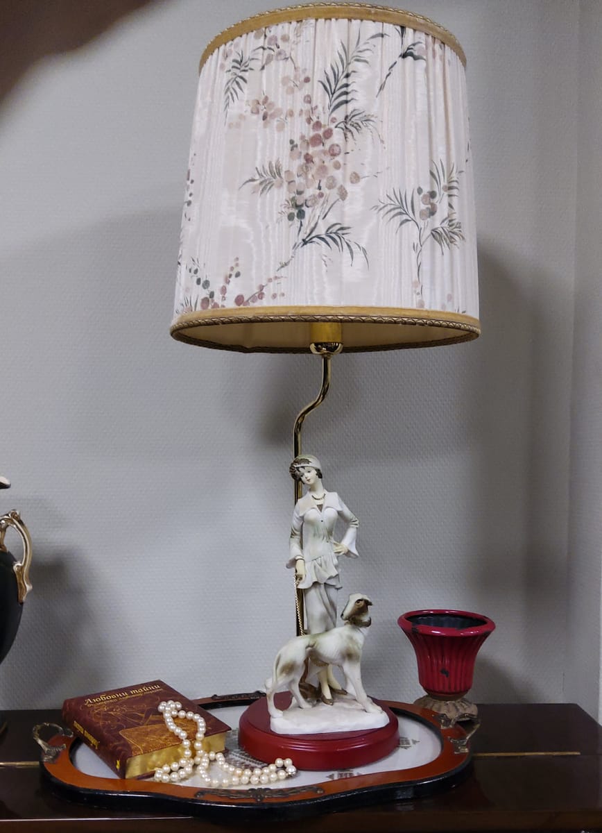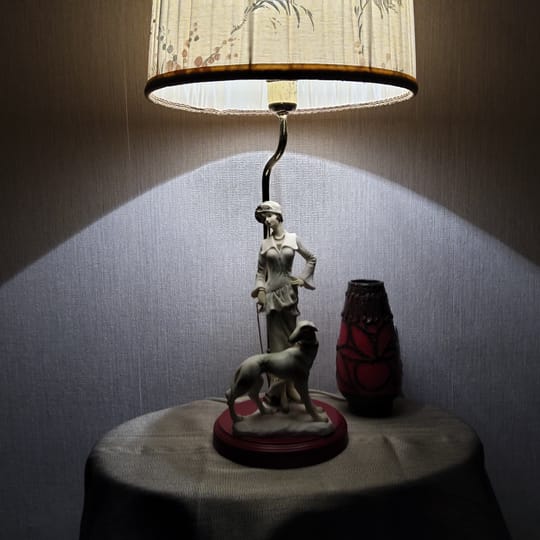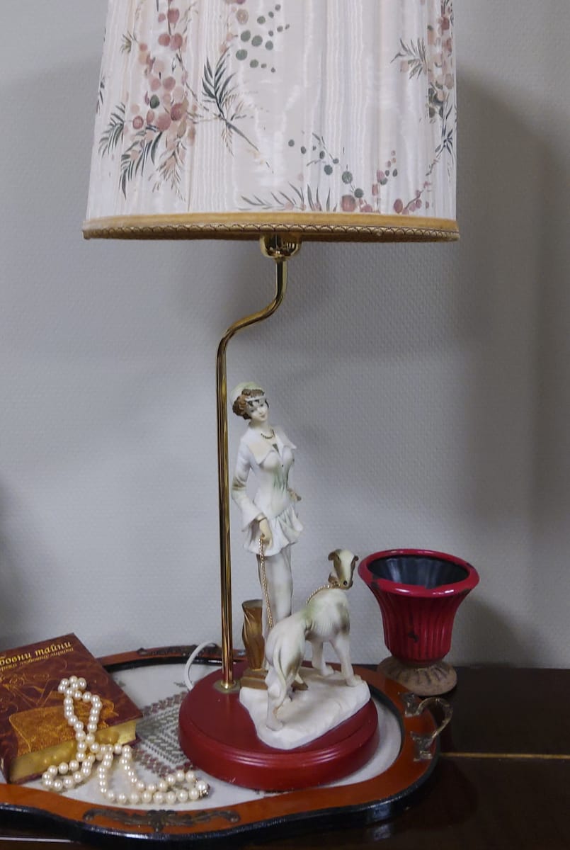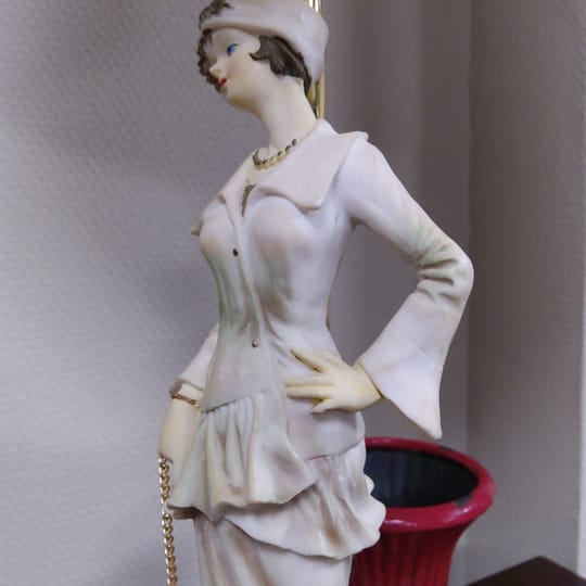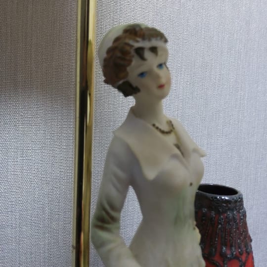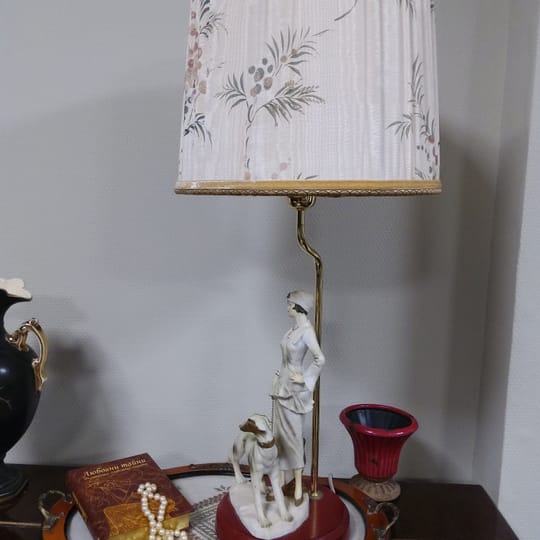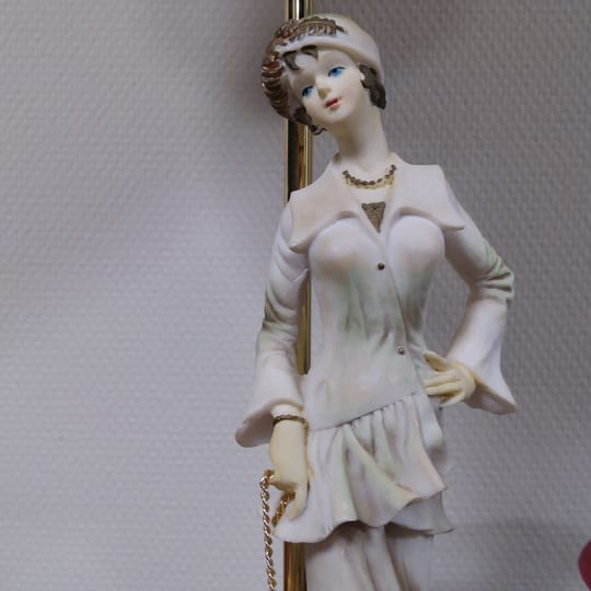 Превъзходни детайли, порцеланова статуетка с дървен постамент в много добро състояние. Метална част към осветителното тяло с пластмасова чашка.