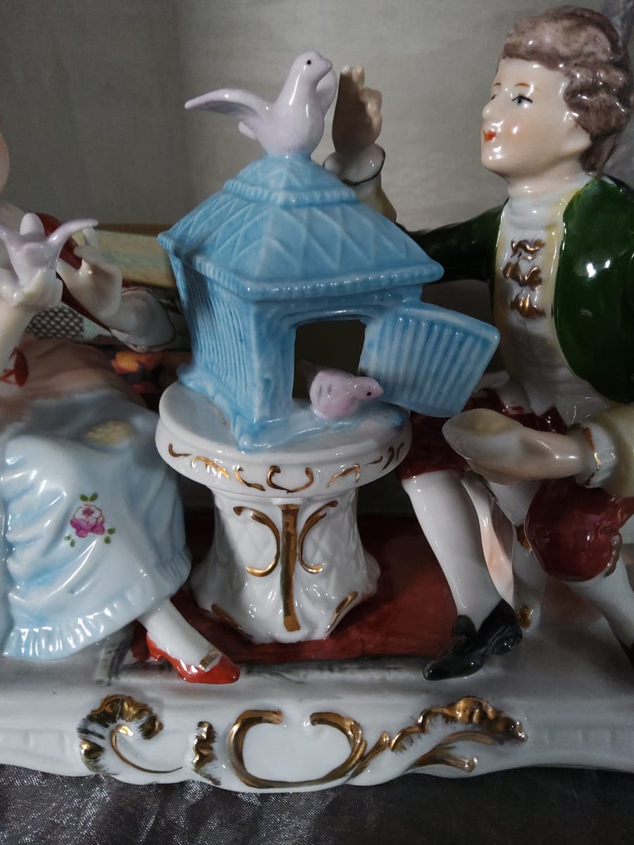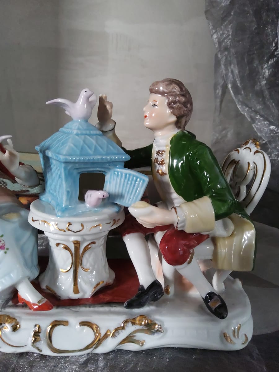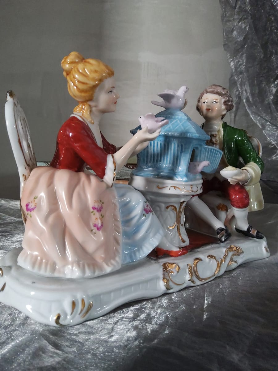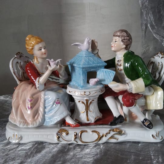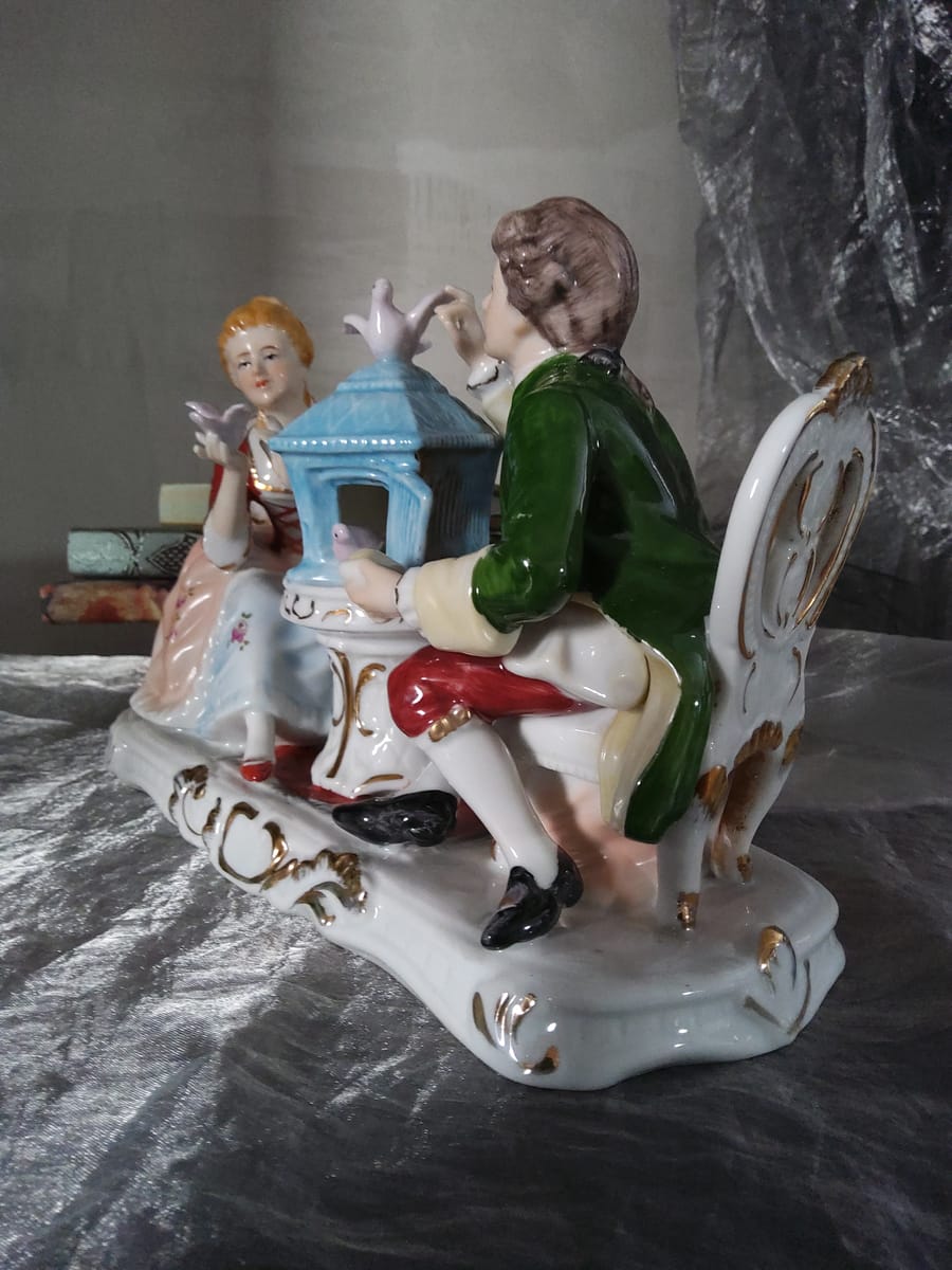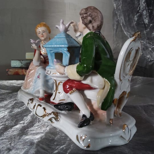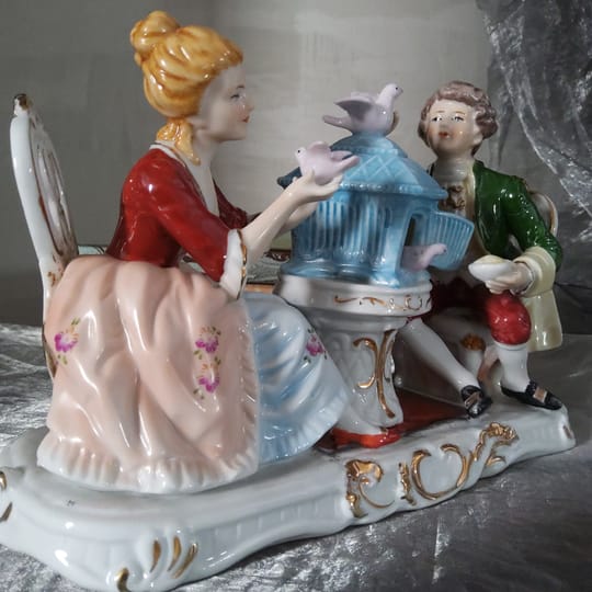 Елегантна порцеланова статуетка, изобразяваща дама и кавалер в галантна сцена с гълъби и декоративна клетка.