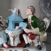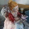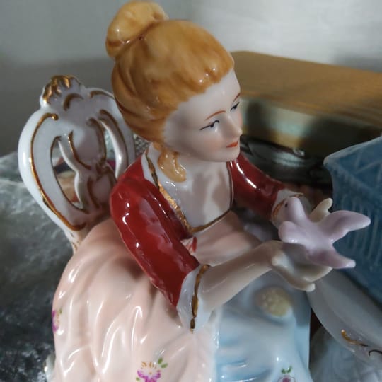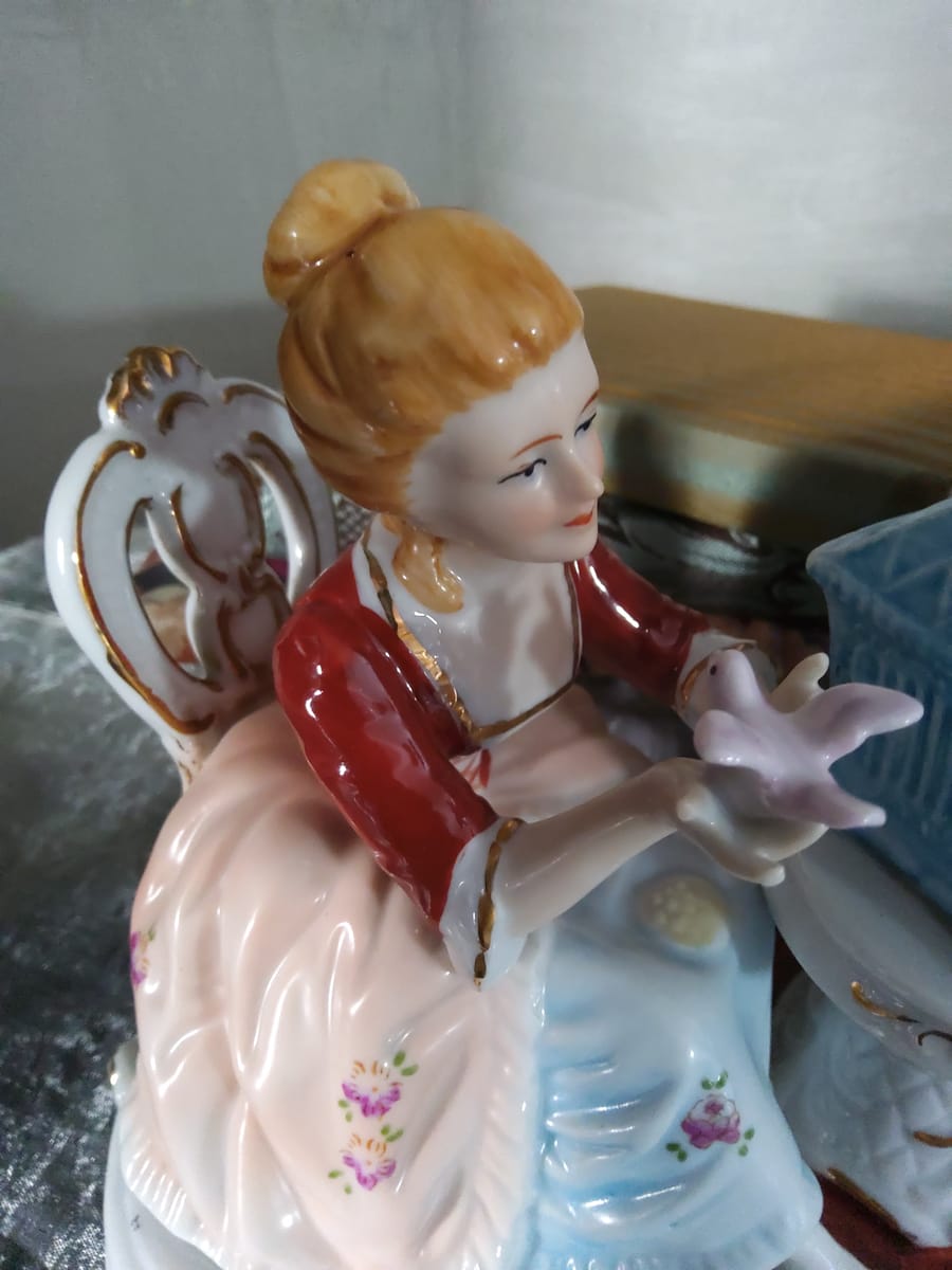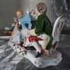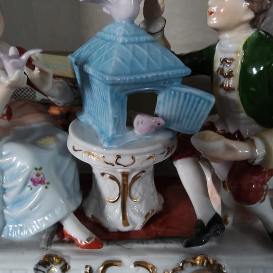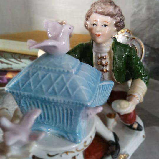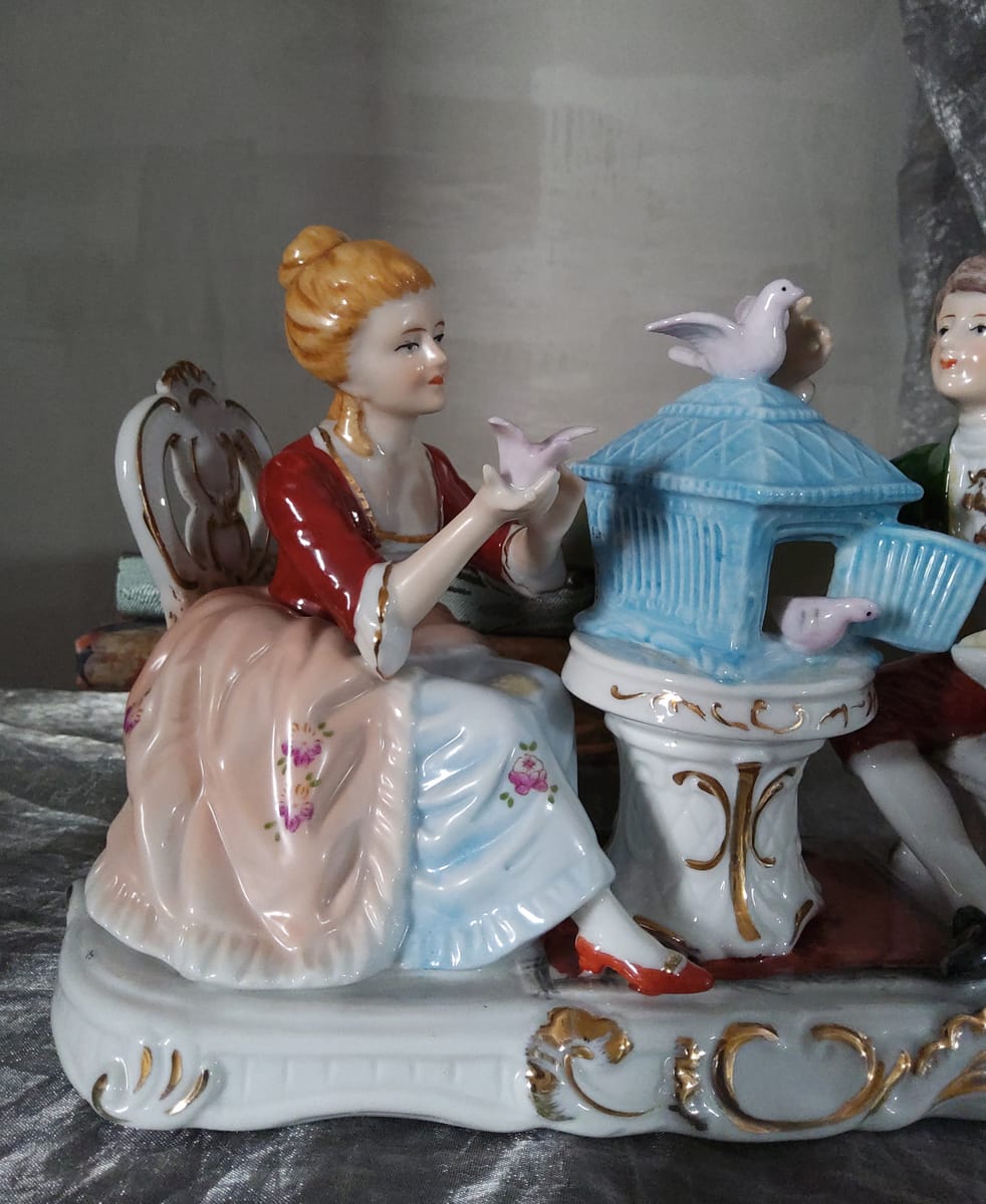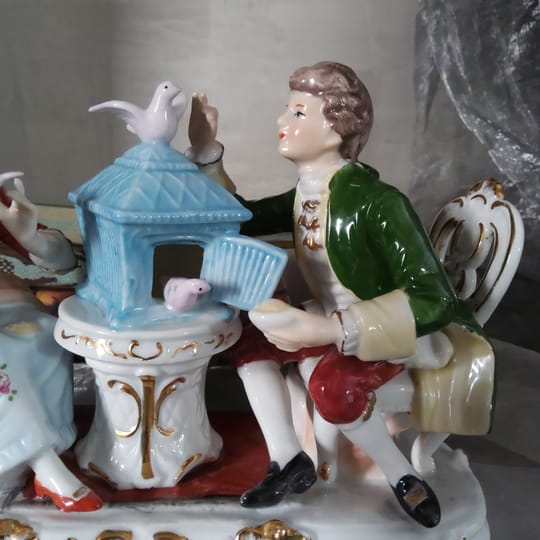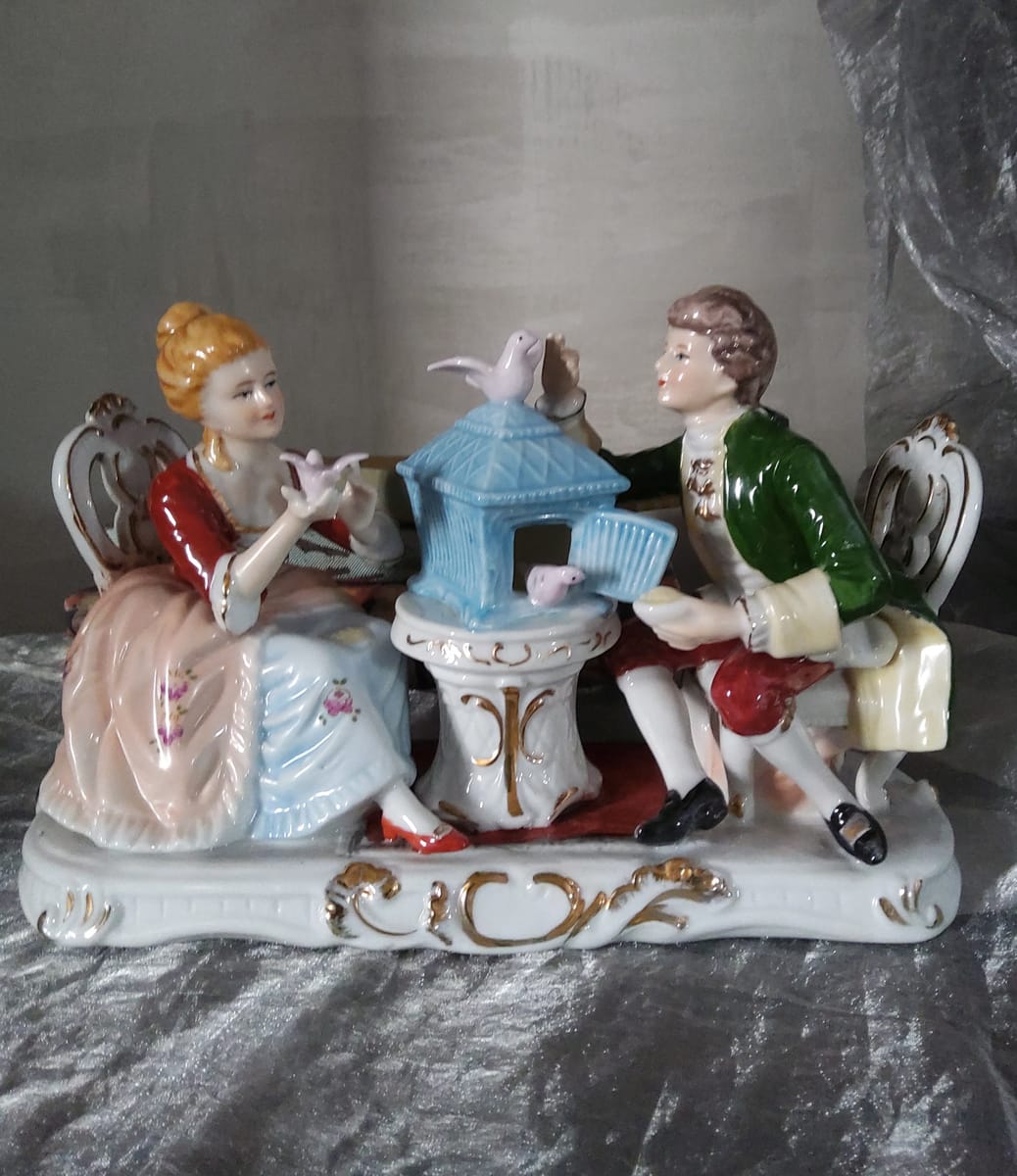 Елегантна порцеланова статуетка, изобразяваща дама и кавалер в галантна сцена с гълъби и декоративна клетка.