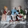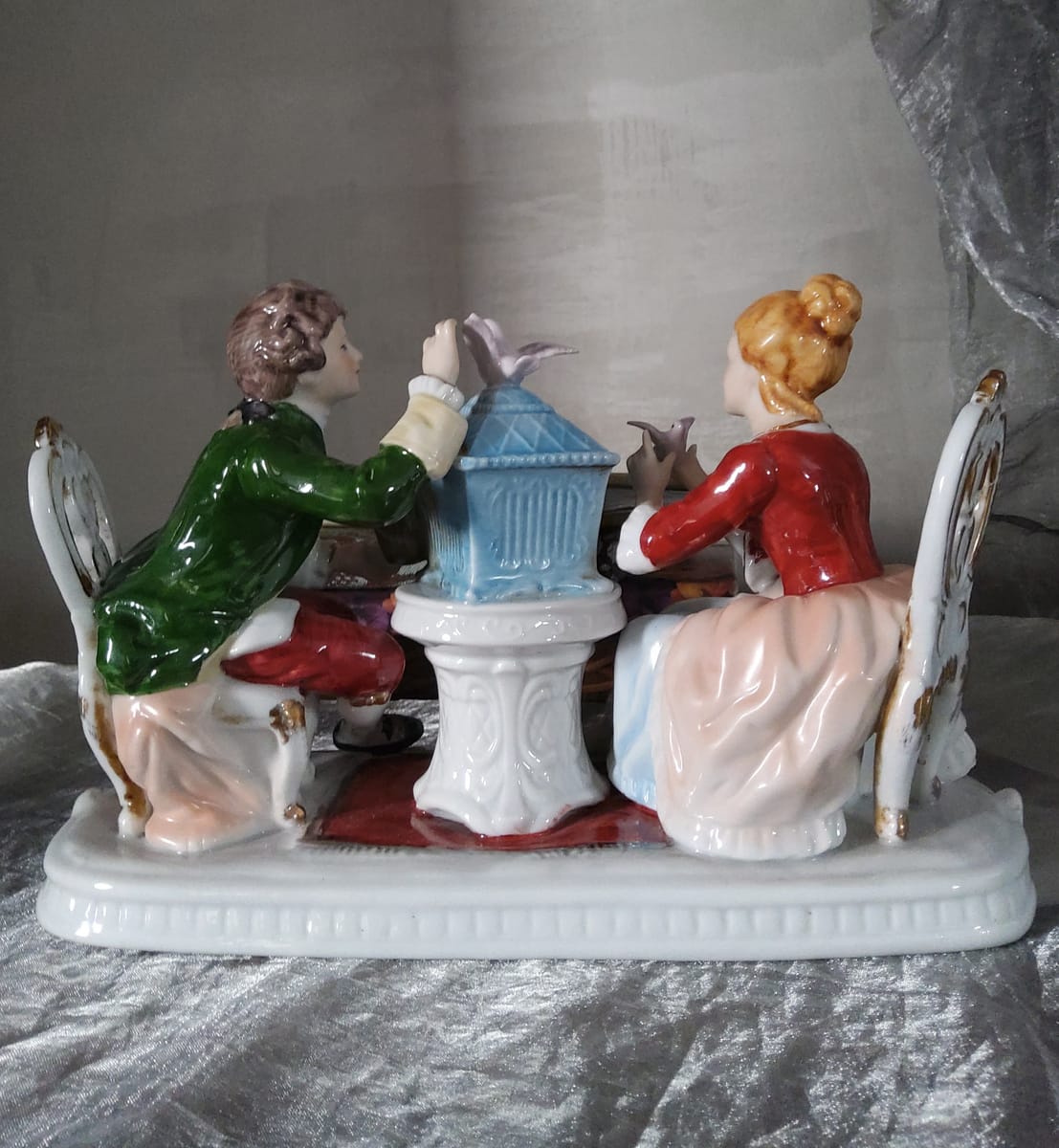 Фигурите са в облекло от XVIII век – типичен аристократичен стил с богати цветове и изящни форми.