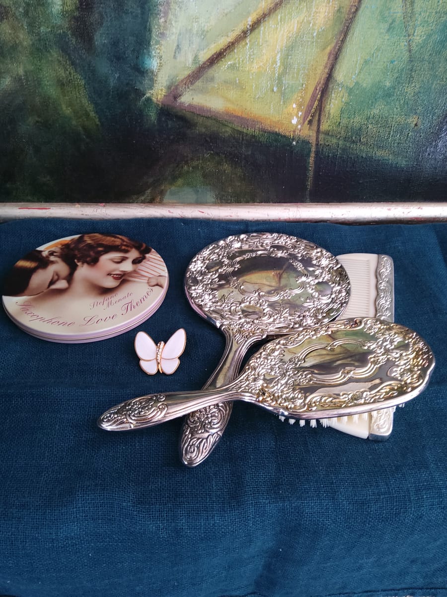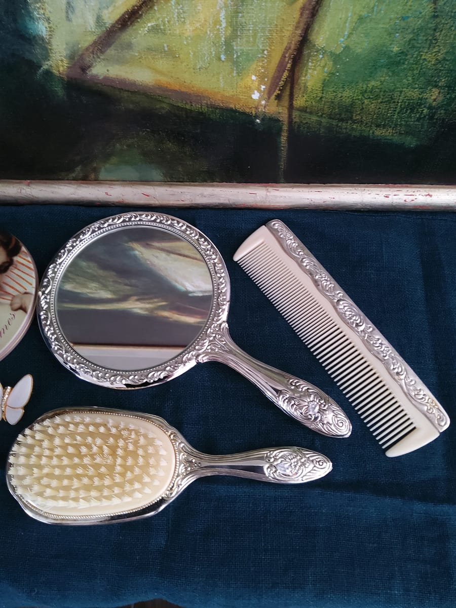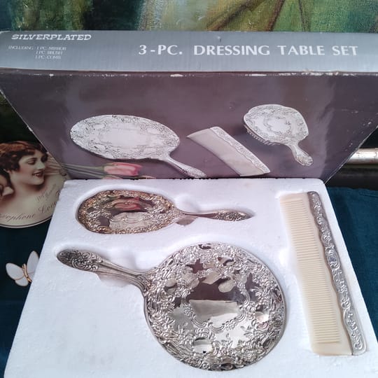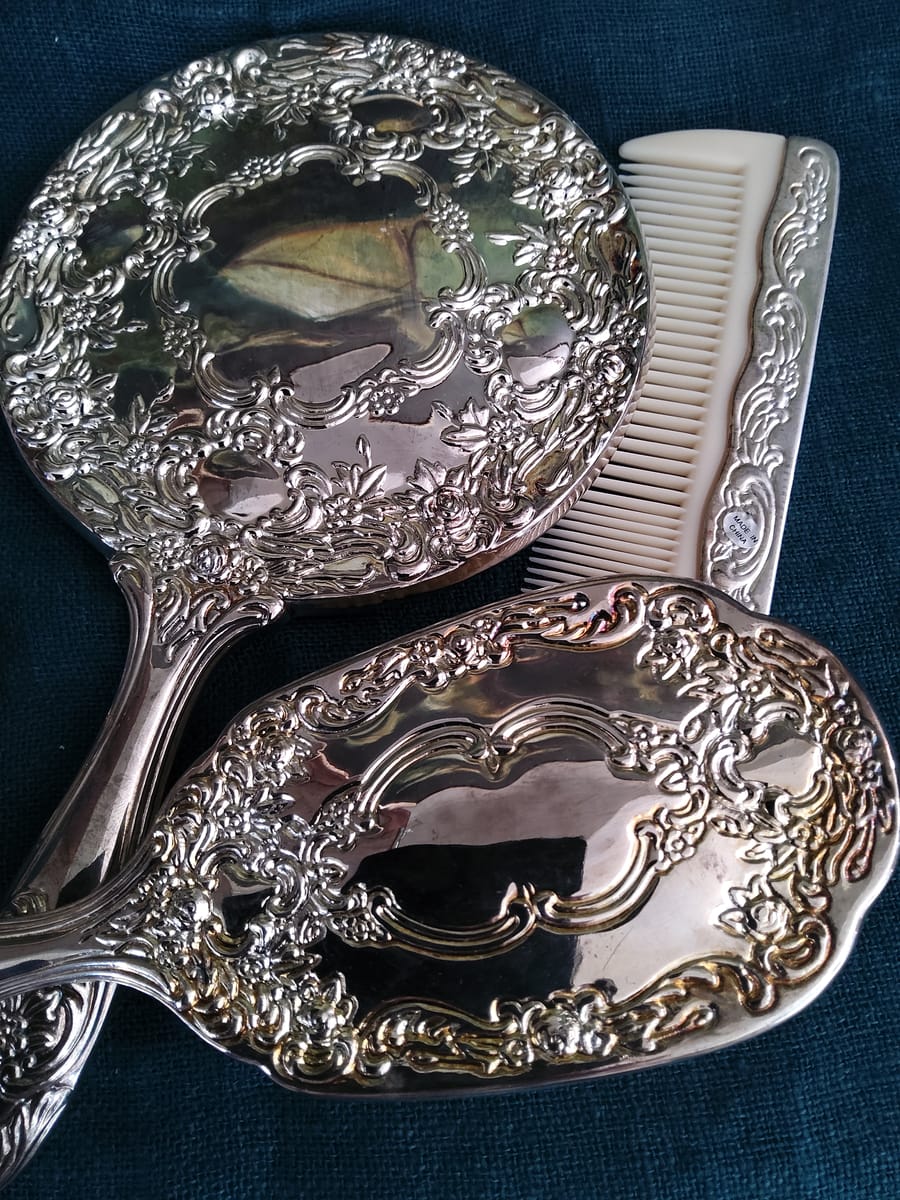 Посребрени огледало, четка и гребен, в оригиналната си кутия.