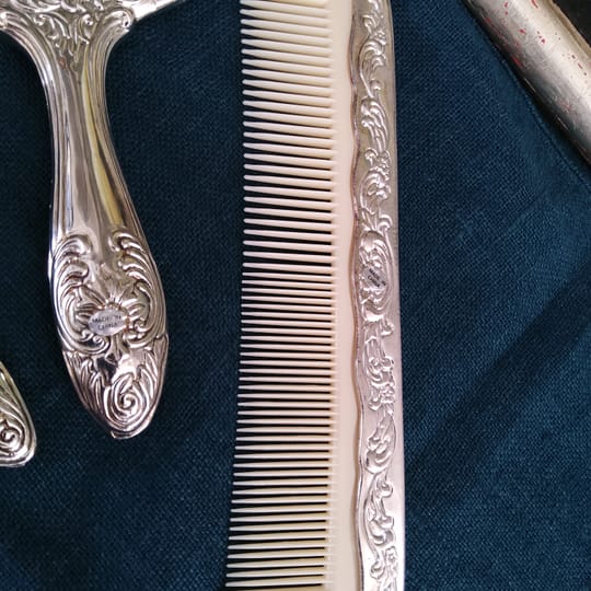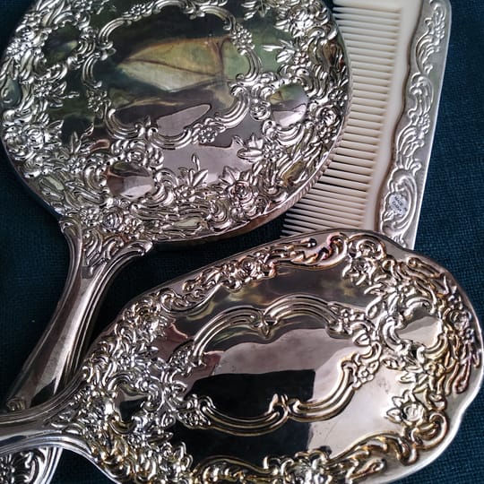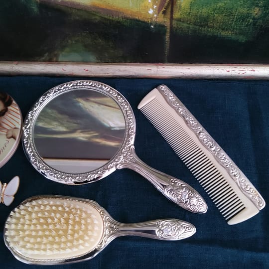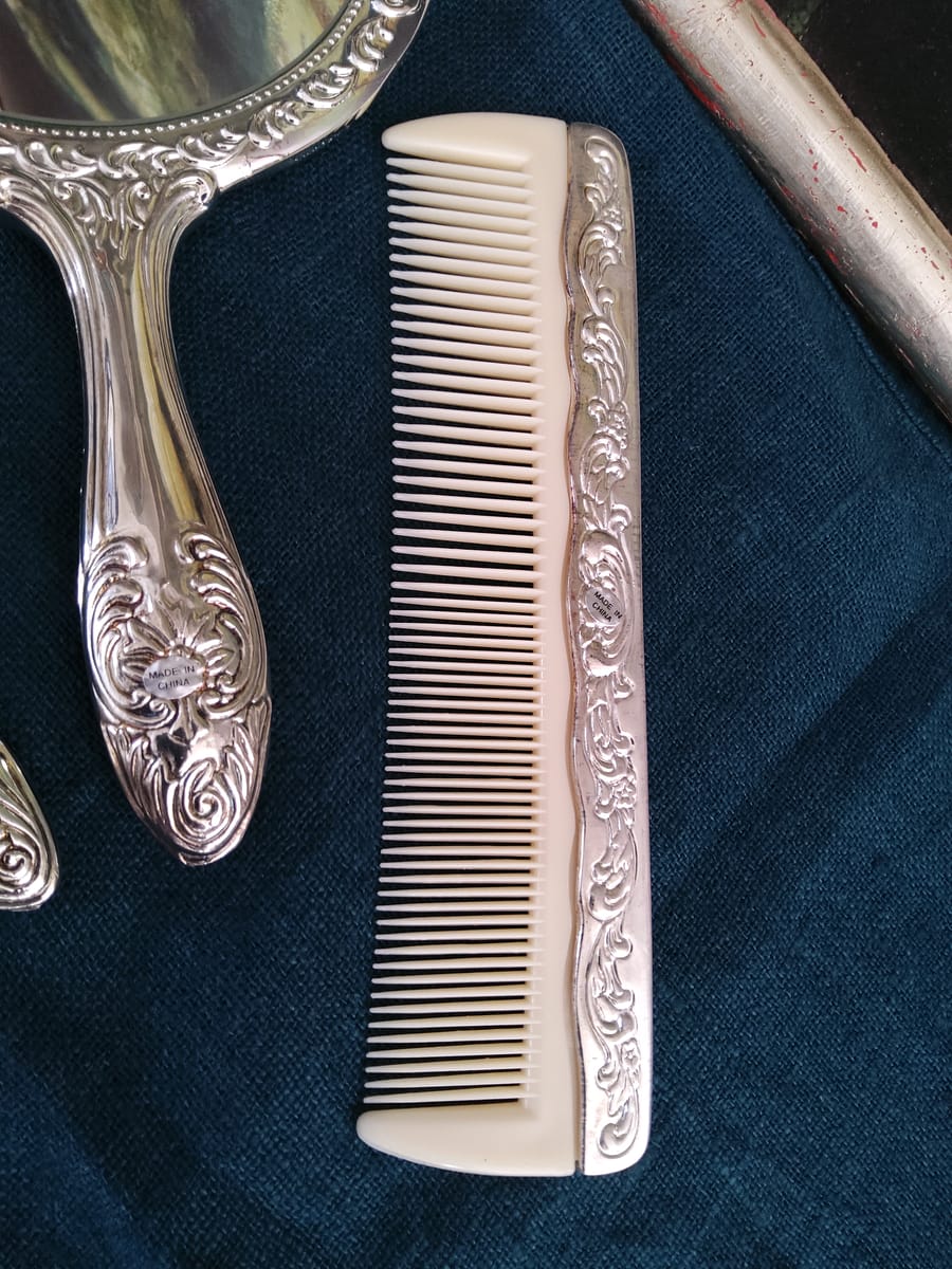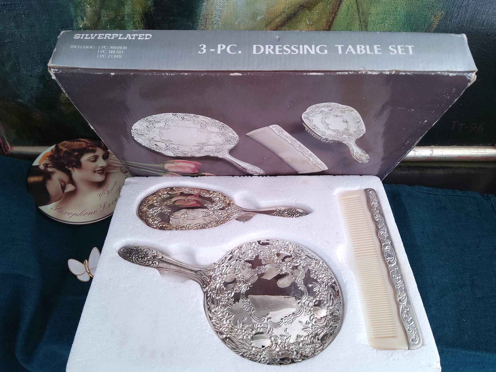 Посребрени огледало, четка и гребен, в оригиналната си кутия.