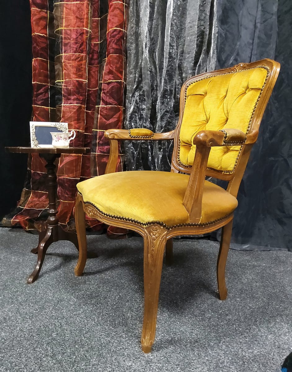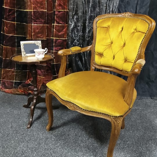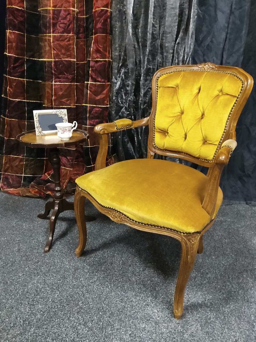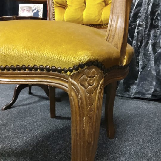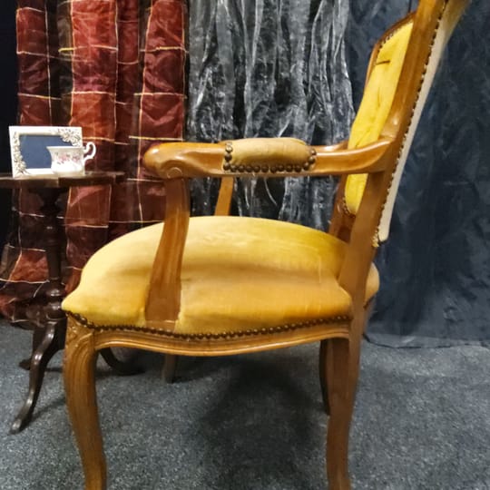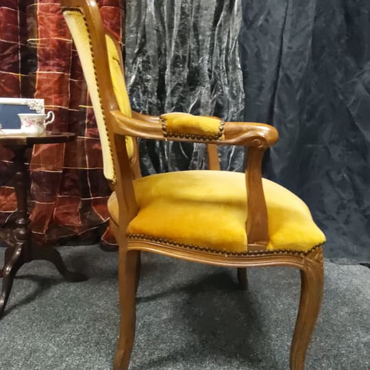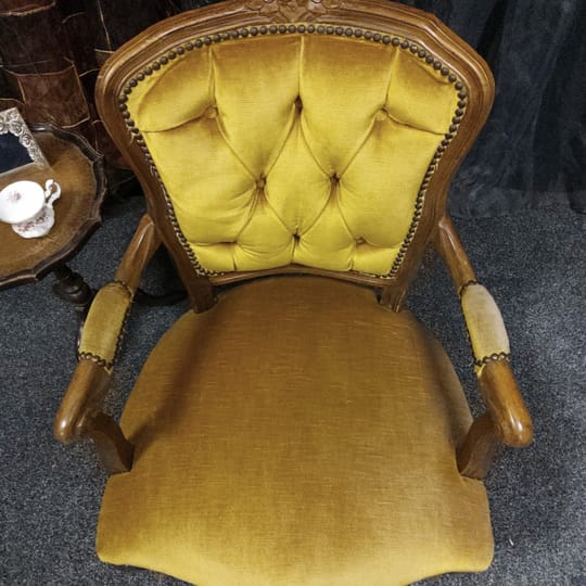 Тапицерията е от дебела, тъкана материя в приглушено жълто/старо злато цвят. Седалката, облегалката и част от подлакътниците са подплатени за комфорт.
