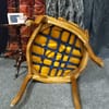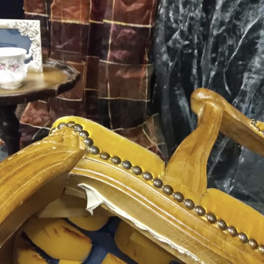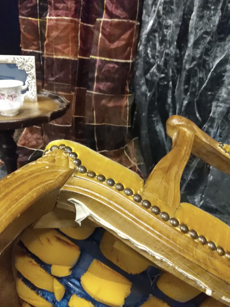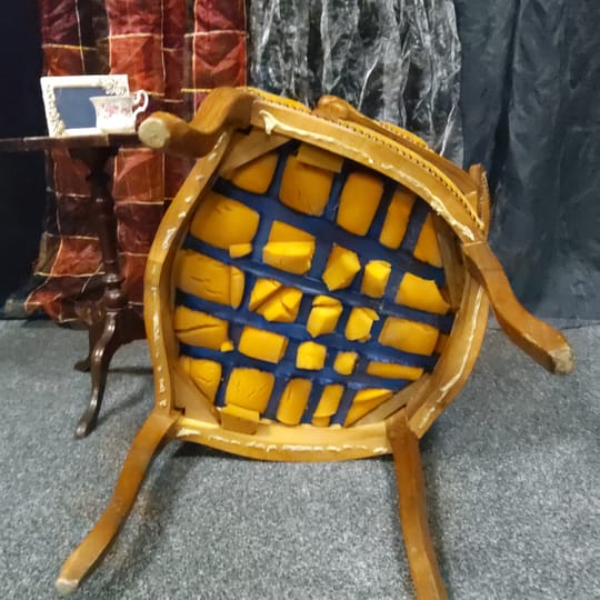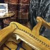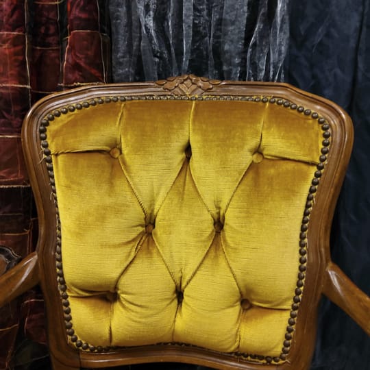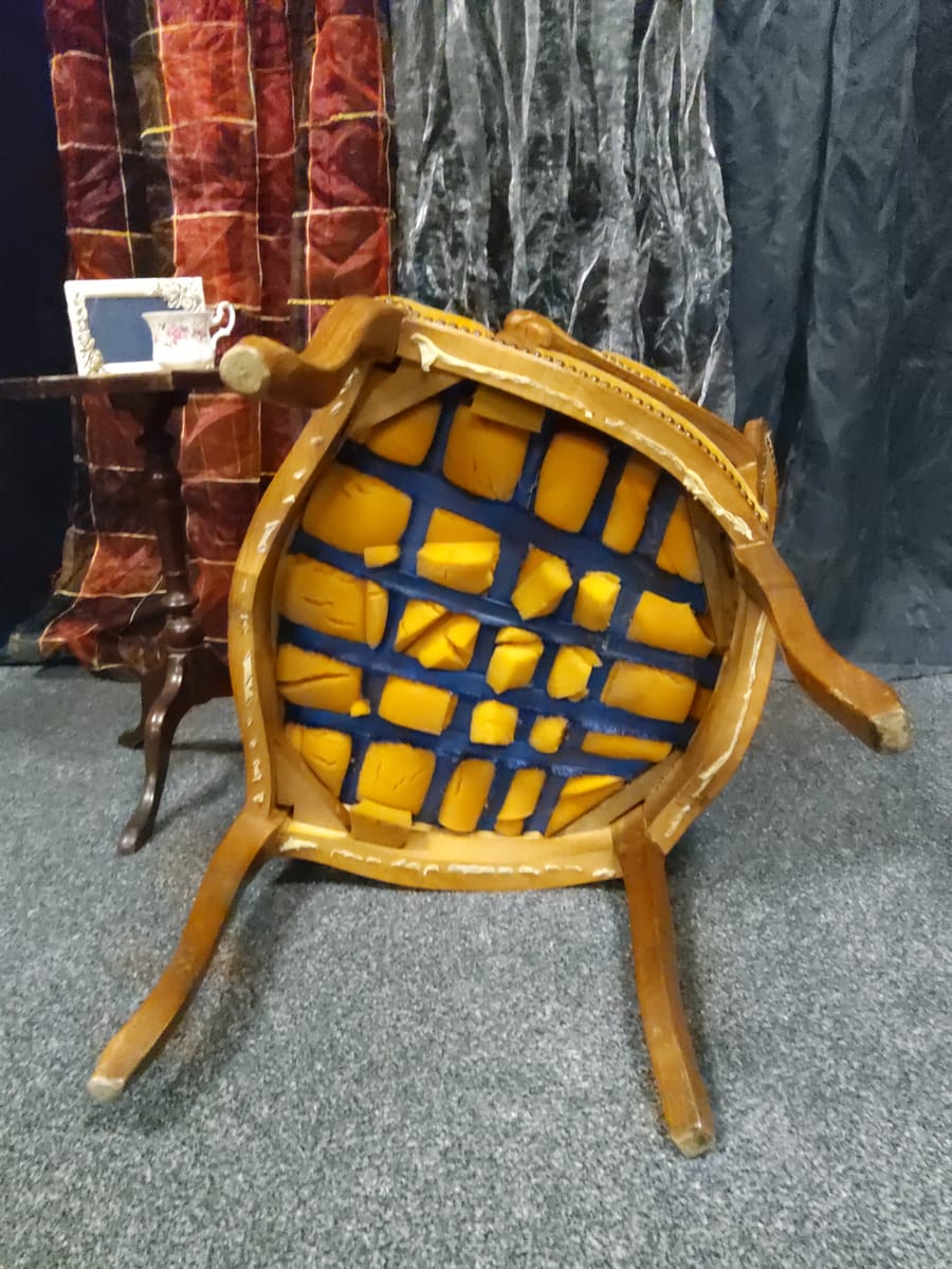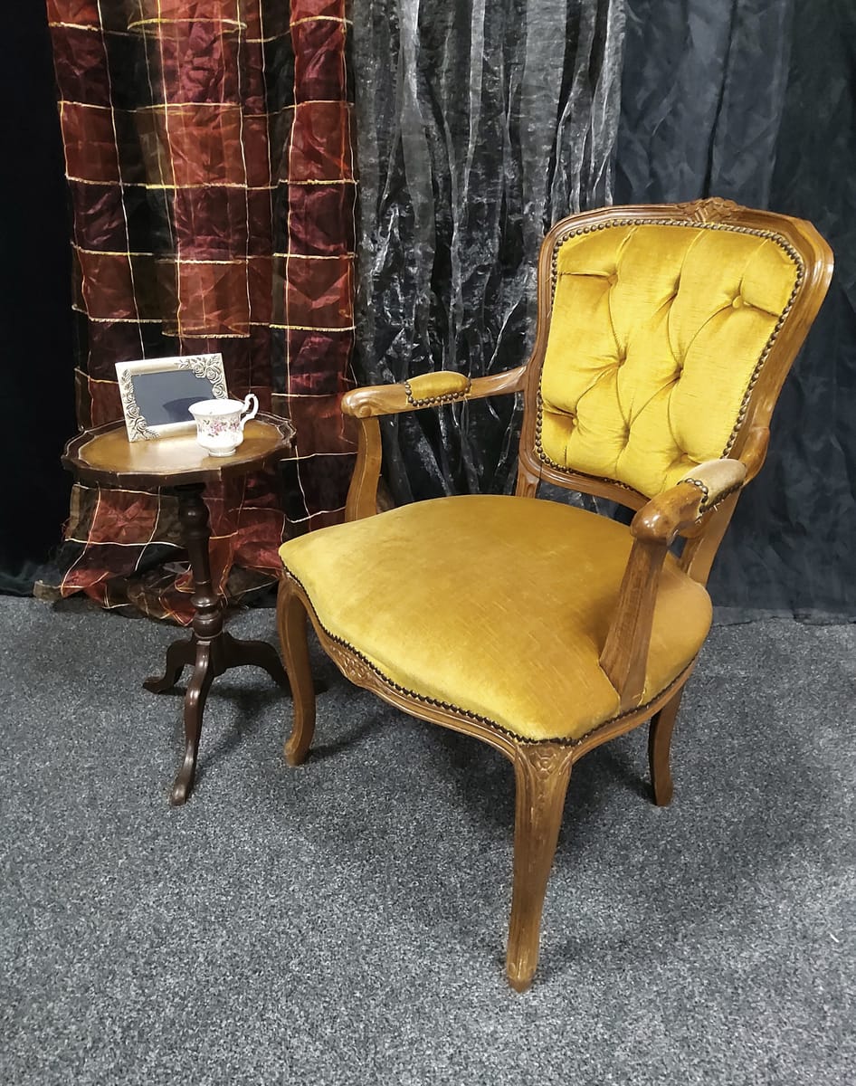 Тапицерията е от дебела, тъкана материя в приглушено жълто/старо злато цвят. Седалката, облегалката и част от подлакътниците са подплатени за комфорт.