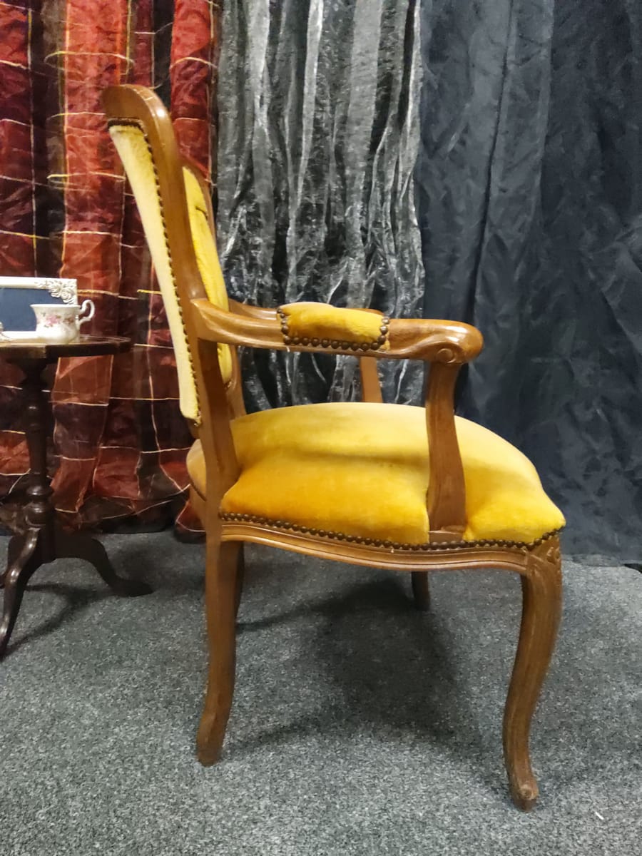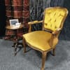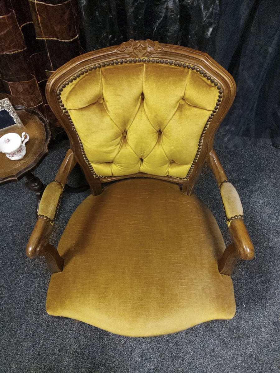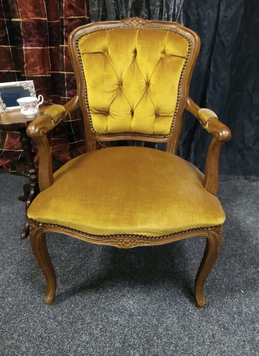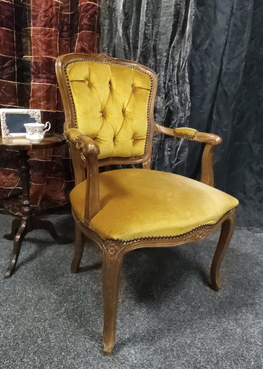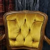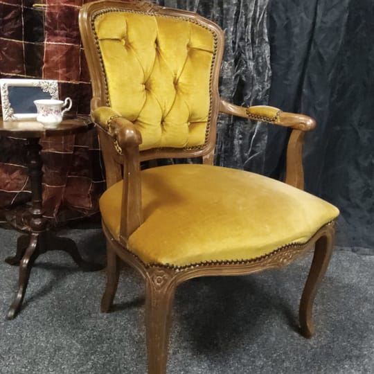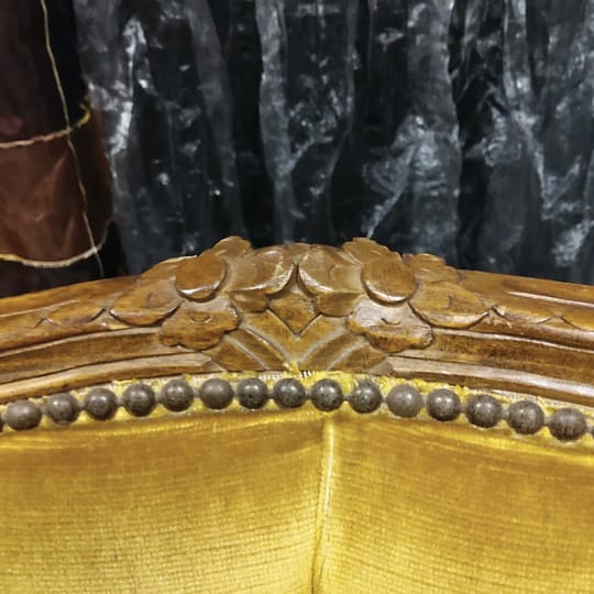 Винтидж тапицирано малко кресло с резбовани дървена рамка и крака, кадифен плат с цвят старо злато.