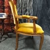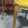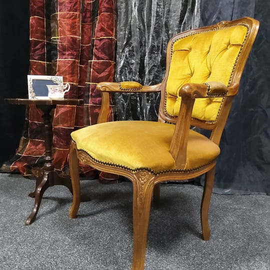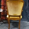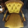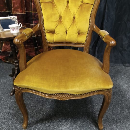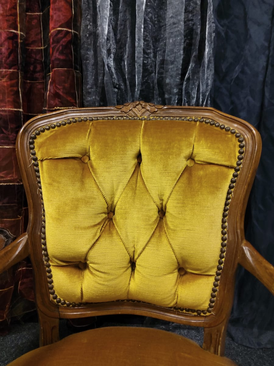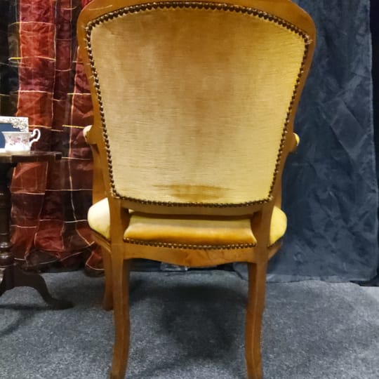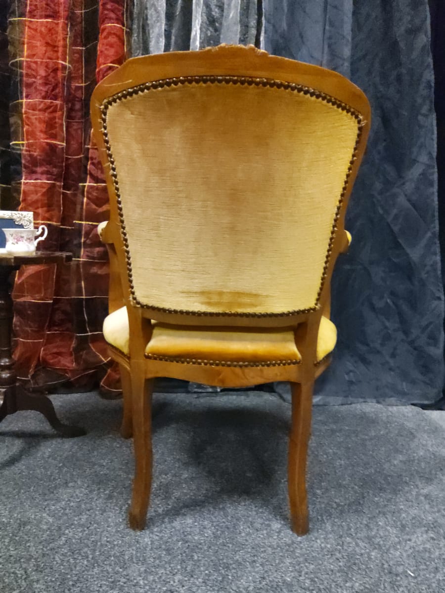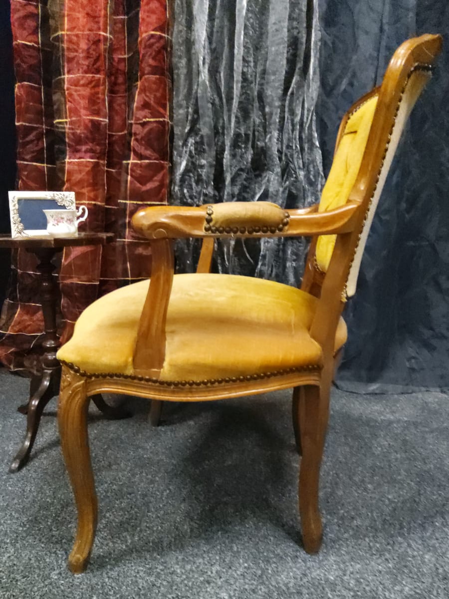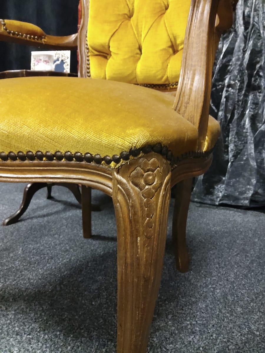 Винтидж тапицирано малко кресло с резбовани дървена рамка и крака, кадифен плат с цвят старо злато.