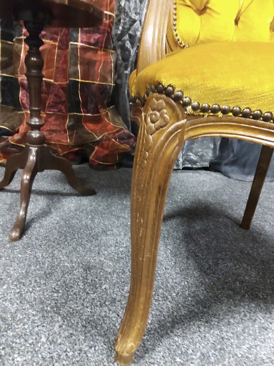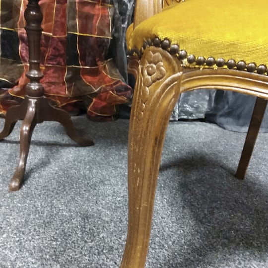Несъмнено акцентите на това бижу са флоралните резбовани мотиви на седалката и облегалката и извитите, също резбовани в завършека си, крака.