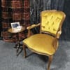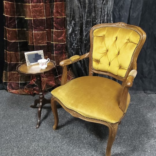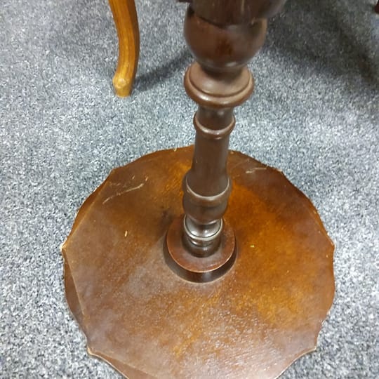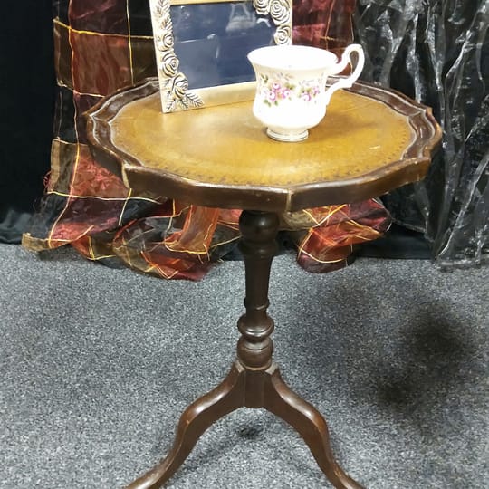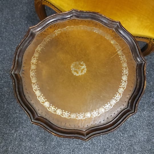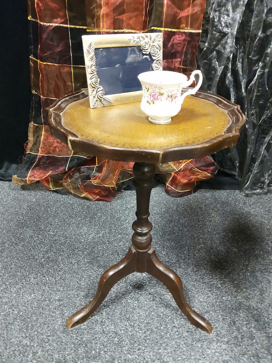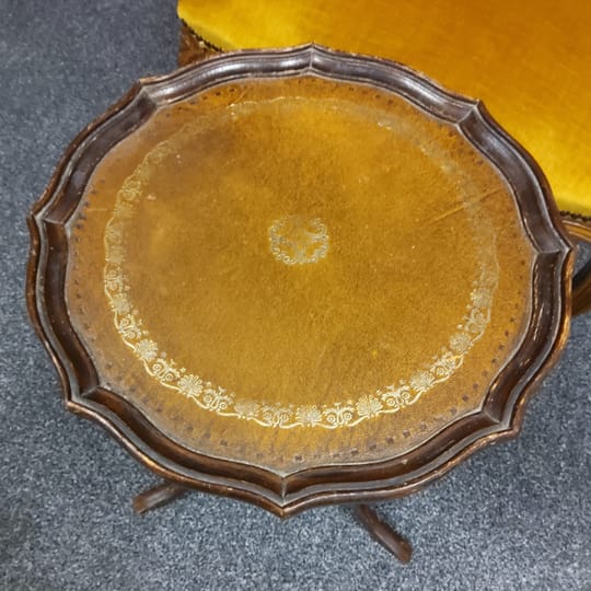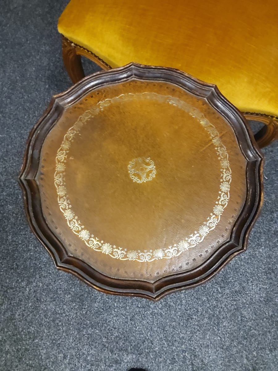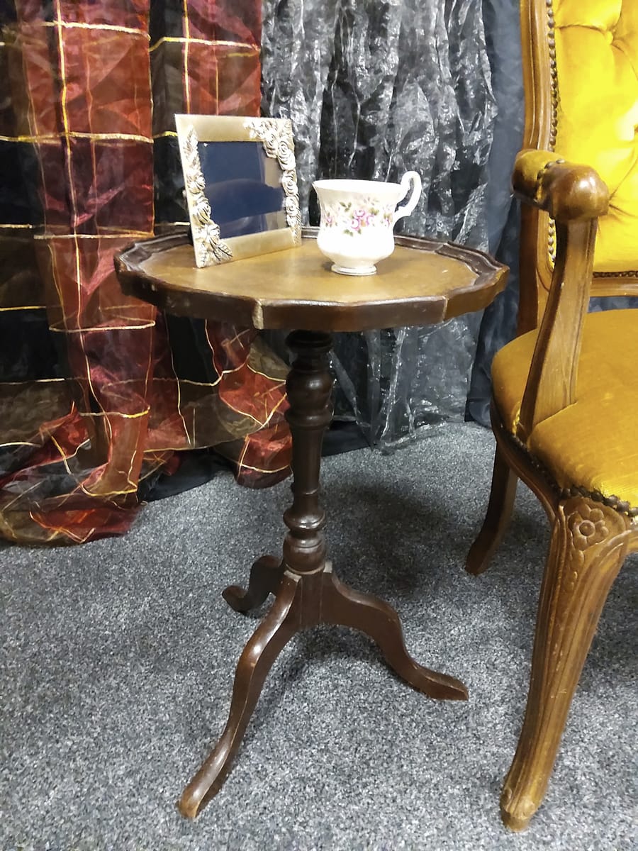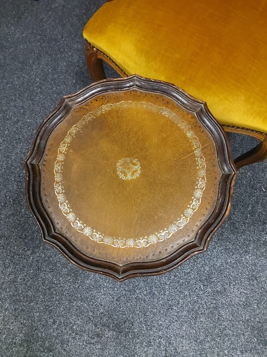 Странична масичка от втората половина на миналия век, 60 те - 80 те години на миналия век. Изработена от дърво, с плот от обработена инкрустирана кожа. Тя би могла да бъде полезна вещ в кътче от Вашия дом, тъй като е лека, лесно преносима и се разглобява в горната част. Реалният и цвят е на снимките с акцент на плота.