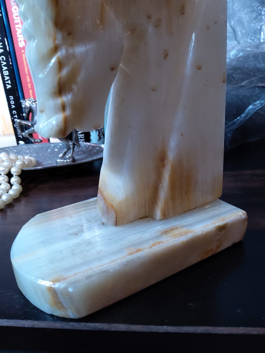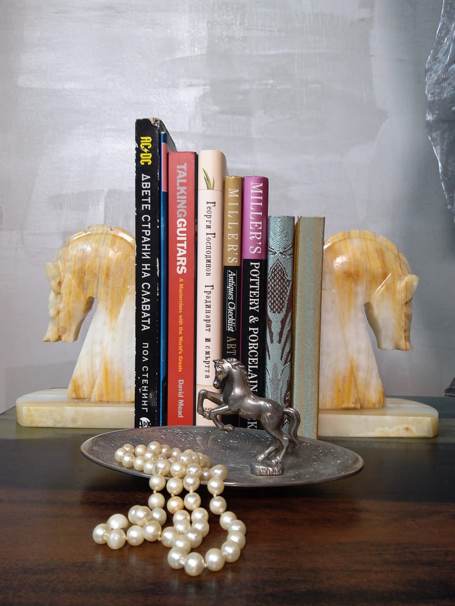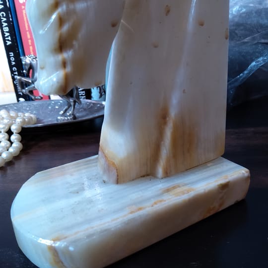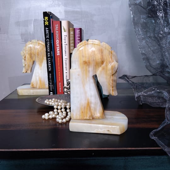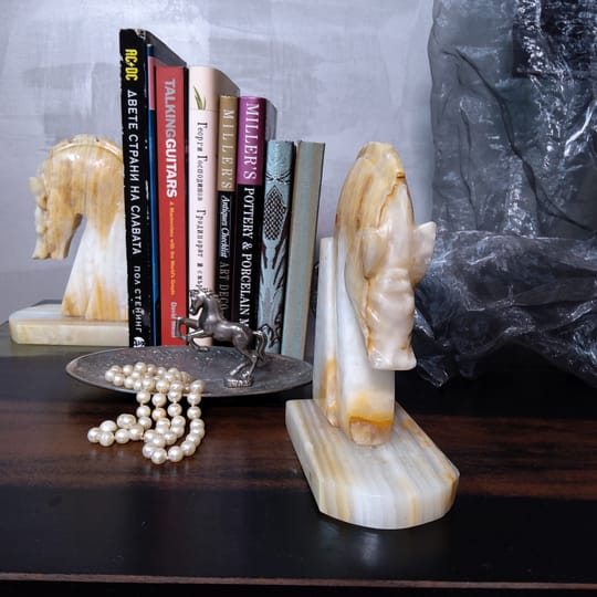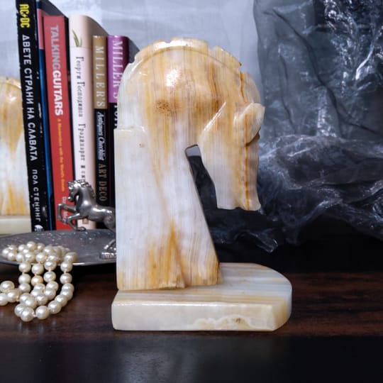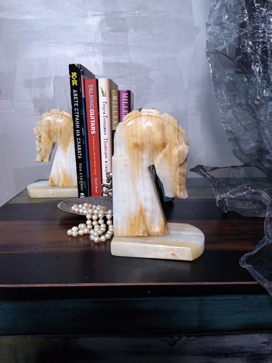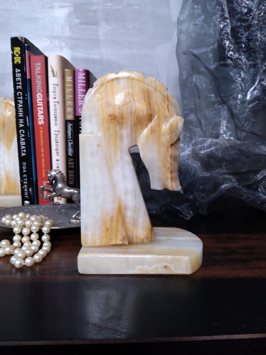 Винтидж резбовани каменни подставки за книги с коне, изработени от оникс с красиви естествени вписванията на цветове.